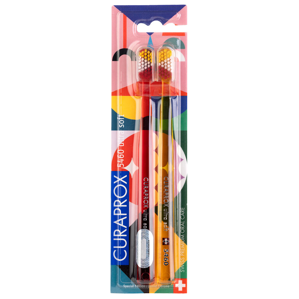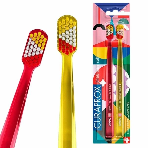 Лимитированный набор зубных щеток CURAPROX ultrasoft 5460 Duo Power Smile 2023. Щетина CUREN® изготовлена из полиэстра, в отличие от обычных зубных щеток, щетина которых сделана полностью из нейлона. Водопоглащаемость полиэстра в шесть раз ниже, поэтому даже во влажном состоянии щетинки CUREN® сохраняют первоначальную упругость и пластичность. Жесткие толстые щетинки обычных зубных щёток не позволяют удалить зубной налёт из десневой бороздки, не прилагая чрезмерного давления. В результате либо в десневой бороздке остаётся зубной налёт, либо повреждается десна. С зубными щётками Курапрокс требуется лишь минимальное давление для удаления зубного налёта из десневой бороздки без повреждения десны.