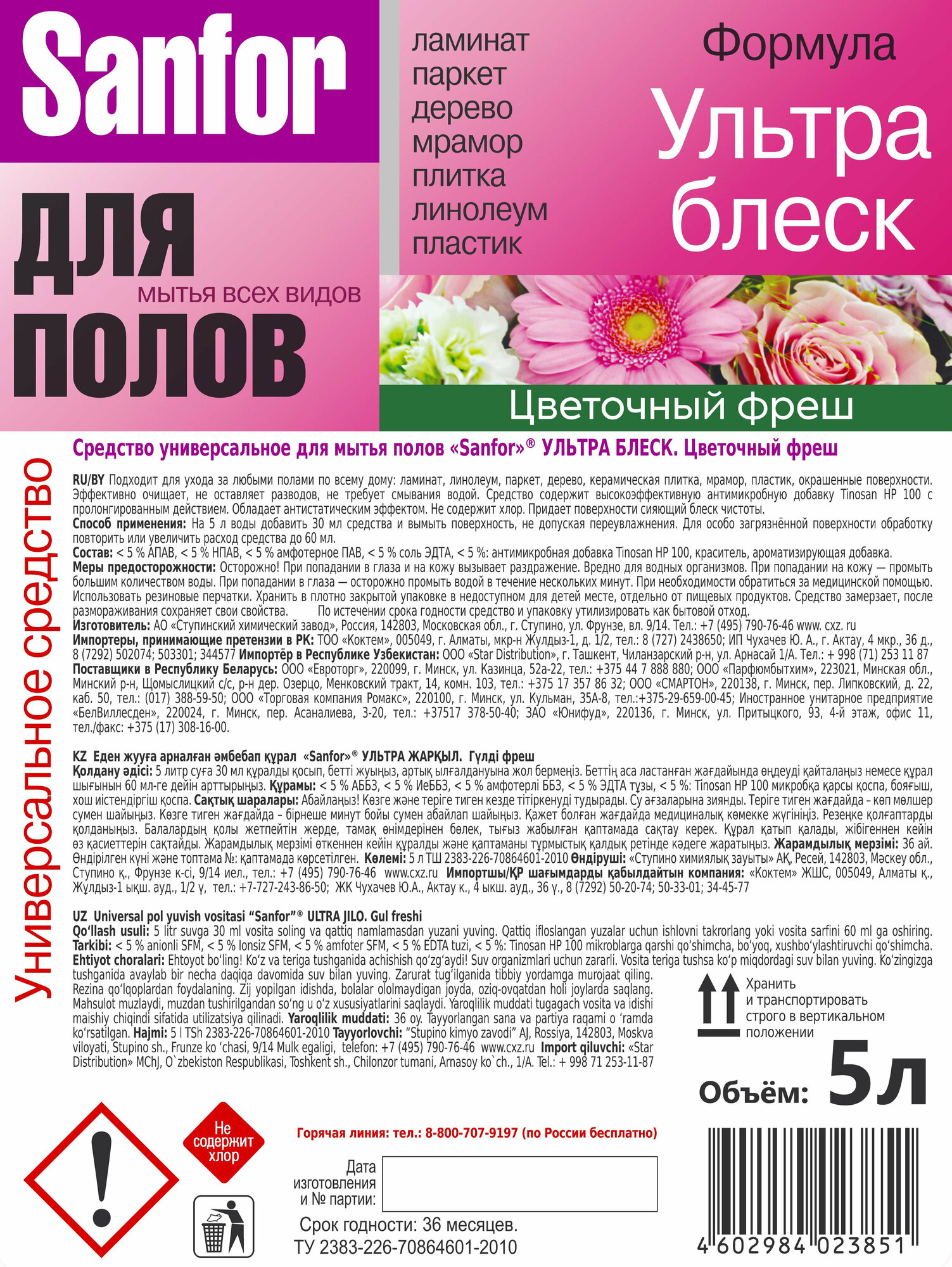 Сервис сравнения цен СкидкаГИД предлагает сравнить цены на товар «Средство для мытья пола Sanfor Ультра Блеск цветочный фреш 1 л (22245)»