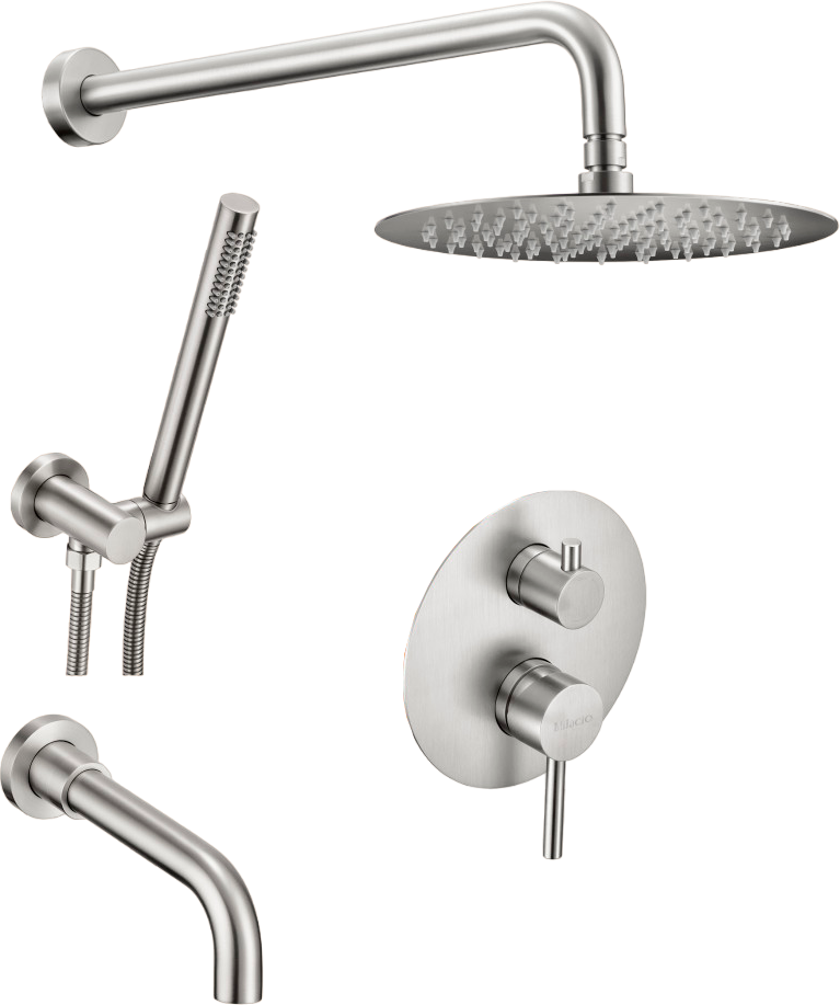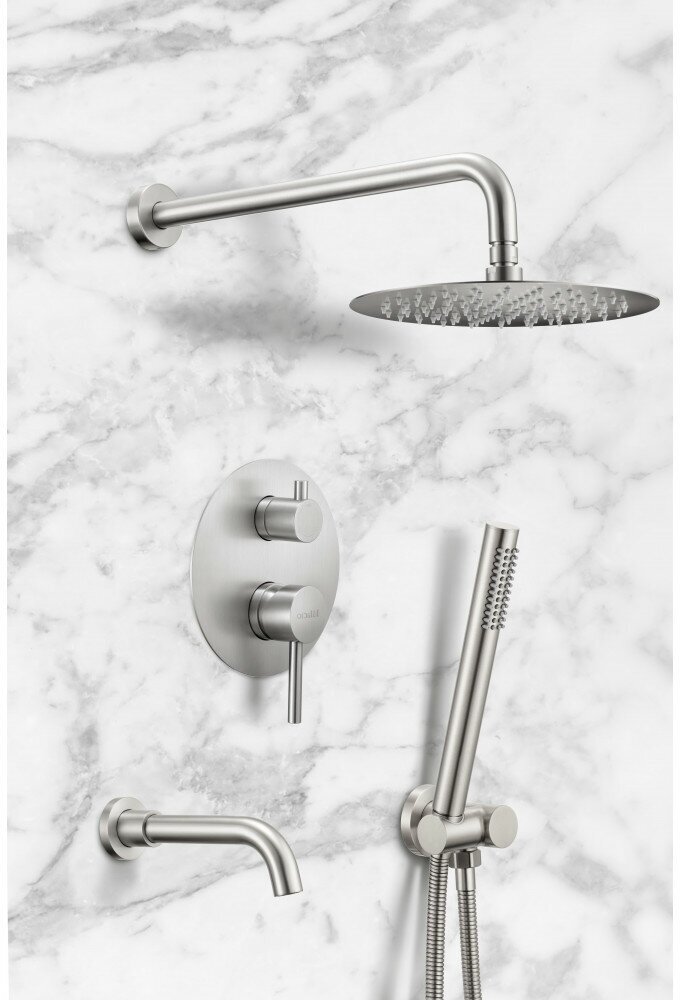 В комплект поставки входит: Смеситель скрытого монтажа - 1 шт. ; кронштейн верхнего душа - 1 шт. ; верхний душ - 1 шт. ; излив - 1 шт. ; держатель ручной лейки - 1 шт. ; ручная лейка - 1 шт. ; шланг - 1 шт. ; ручки управления - 2 шт. ; отражатели - 4 шт. ; накладка на переключатель режимов - 1 шт. ; паспорт - 1 шт.