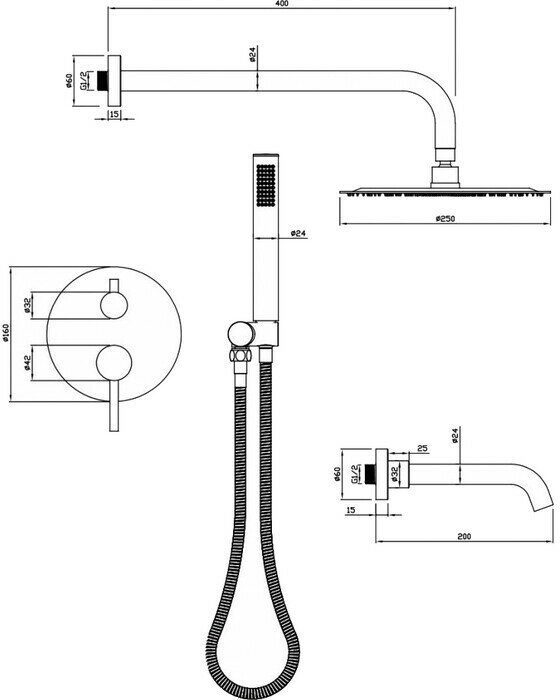 | Оснащение | Душевая лейка / Шланг для душа / Держатель душа / Кронштейн для верхнего душа / Излив / Скрытая монтажная часть |