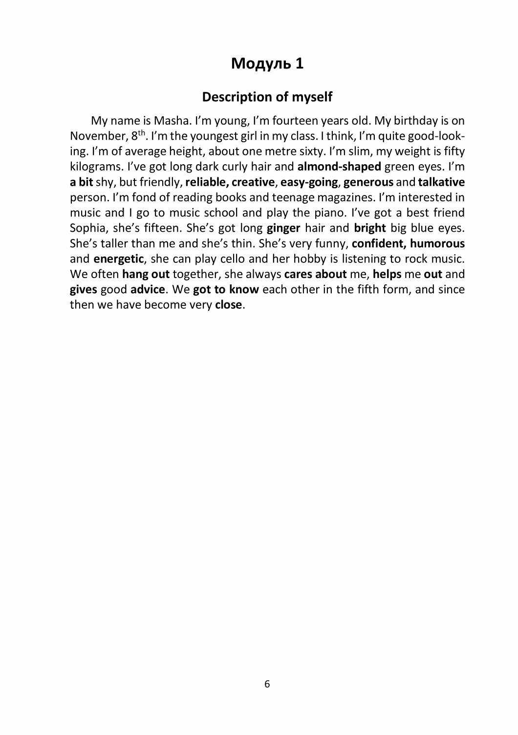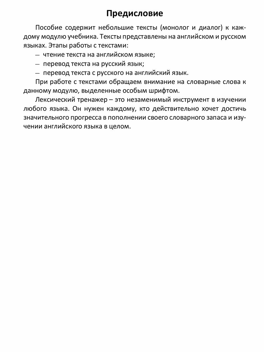 Пособие содержит небольшие тексты (монолог и диалог) к каждому модулю учебника. Тексты представлены на английском и русском языках. Этапы работы с текстами: