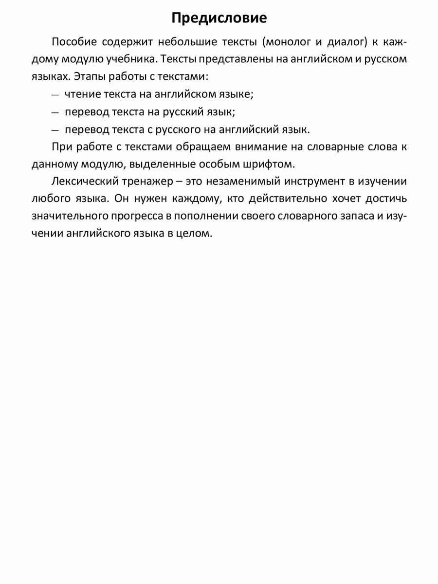 Пособие содержит небольшие тексты (монолог и диалог) к каждому модулю учебника. Тексты представлены на английском и русском языках. Этапы работы с текстами: