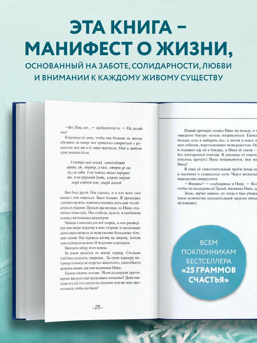 В новой книге от автора бестселлера «25 граммов счастья. История маленького ежика, который изменил жизнь человека» вы найдете не только трогательные рассказы о жизни маленьких ежат, но и удивительную историю спасения дельфина Каси из заброшенного тегеранского дельфинария. Потеряв свободу и своих сородичей, Кася умирала от тоски. С этого момента началась эпическая история вызволения дельфина, в котором участвовали добровольцы из Ирана, Италии, России и других стран. Итальянский ветеринар столкнулся с рядом трудностей, но, продолжая заботиться о своих маленьких подопечных, умело справился с решением непредвиденных обстоятельств в масштабной операции по спасению еще одной жизни.
