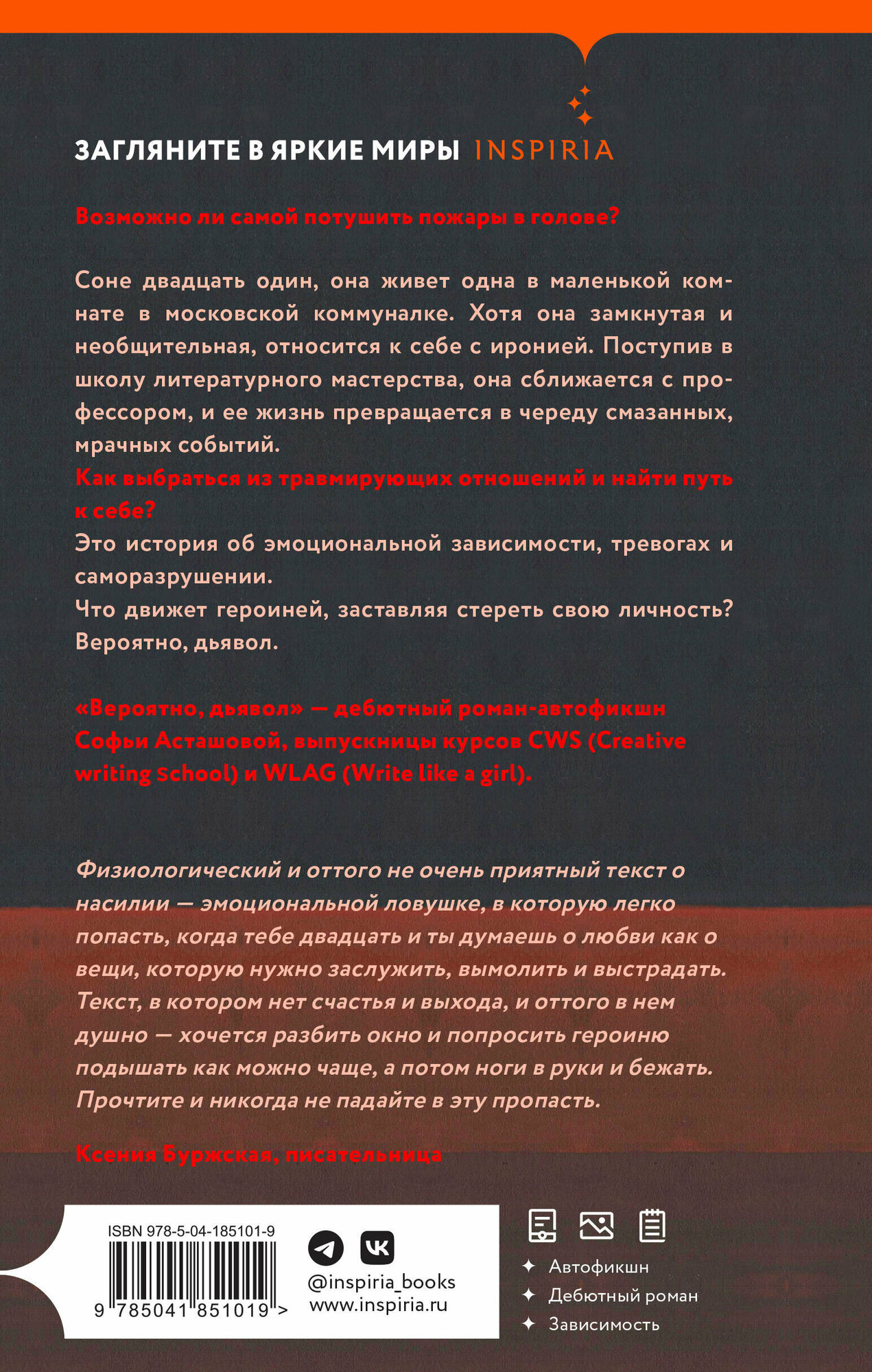 "Вероятно, дьявол" - дебютный роман-автофикшен Софьи Асташовой, выпускницы курсов CWS (Creative writing school) и WLAG (Write like a girl).