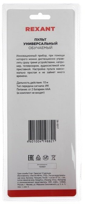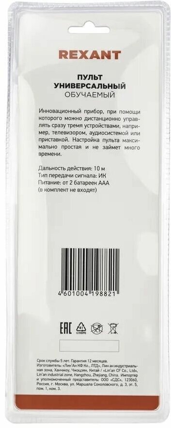 Универсальный обучаемый пульт REXANT на 3 устройства - приспособление, при помощи которого можно дистанционно управлять сразу несколькими устройствами, например, телевизором, аудиосистемой, приставкой и т. д. Это очень удобно, так как один пульт заменяет несколько, экономит время и избавляет от завалов лишней техники. Поддерживает все необходимые функции, обеспечивающие максимально полное и удобное управление тремя устройствами одновременно.