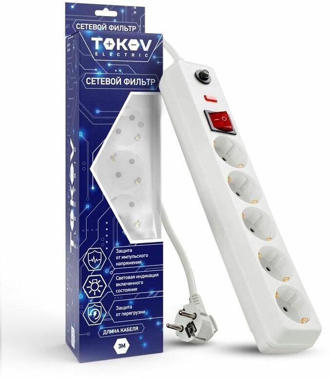 Удлинитель с сетевым фильтром TOKOV ELECTRIC предназначен для подключения и защиты от перегрузок и импульсных помех в электрической сети всех видов бытовой и офисной техники.Преимущества Максимальная суммарная мощность нагрузки - 3,5 кВт Длина кабеля - 3 м Количество розеток - 5 шт. Тип розеток - 2P+2E Индикация работоспособности защиты Выключатель с индикацией наличия сети Термовыключатель