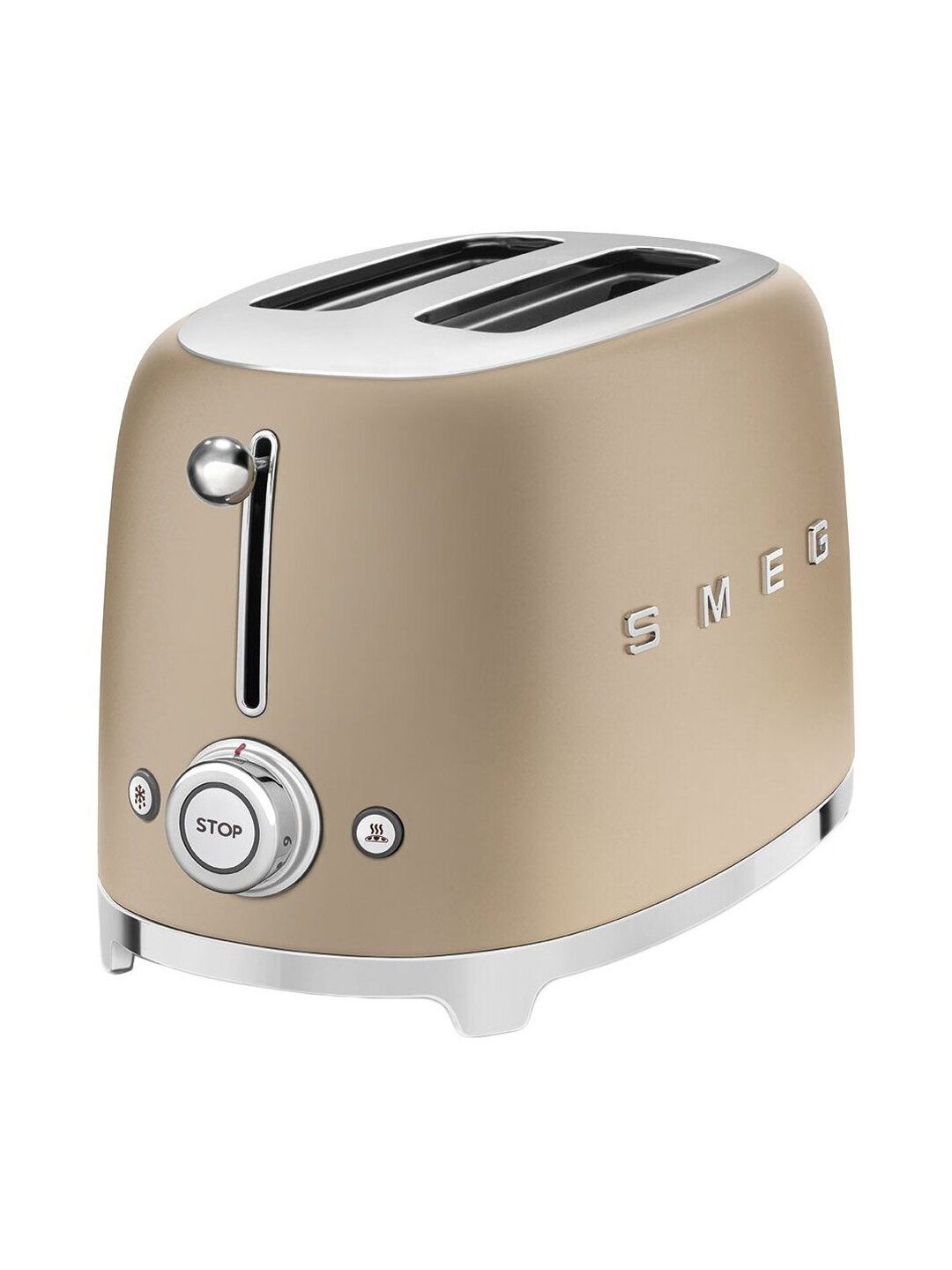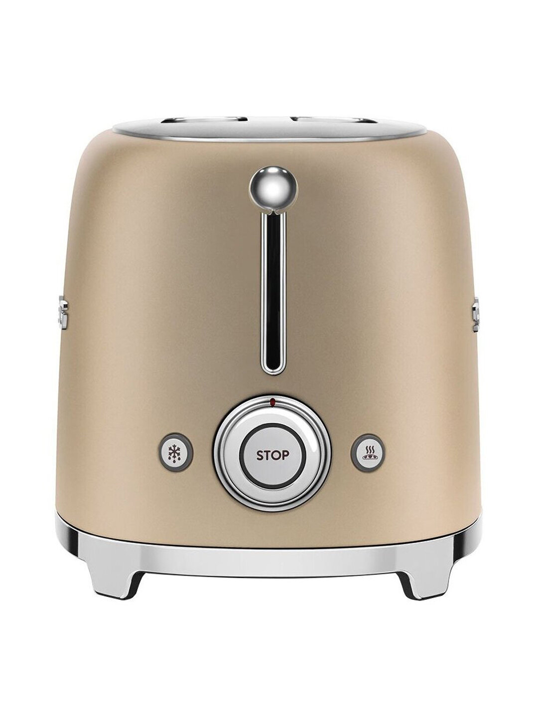 Тостер ''Smeg TSF01PGEU'' из серии ''Стиль 50-х''. На круглой ручке расположена шкала поджаривания. Вращая ручку, можно выбрать одну из 6 степеней поджаривания тостов. Если результат покажется неудовлетворительным, можно продолжить цикл поджаривания с помощью функции подогрева. Когда необходимо отменить или прервать цикл поджаривания, можно нажать кнопку ''Стоп'' в центре ручки. Функция размораживания предназначена для поджаривания замороженных тостов.