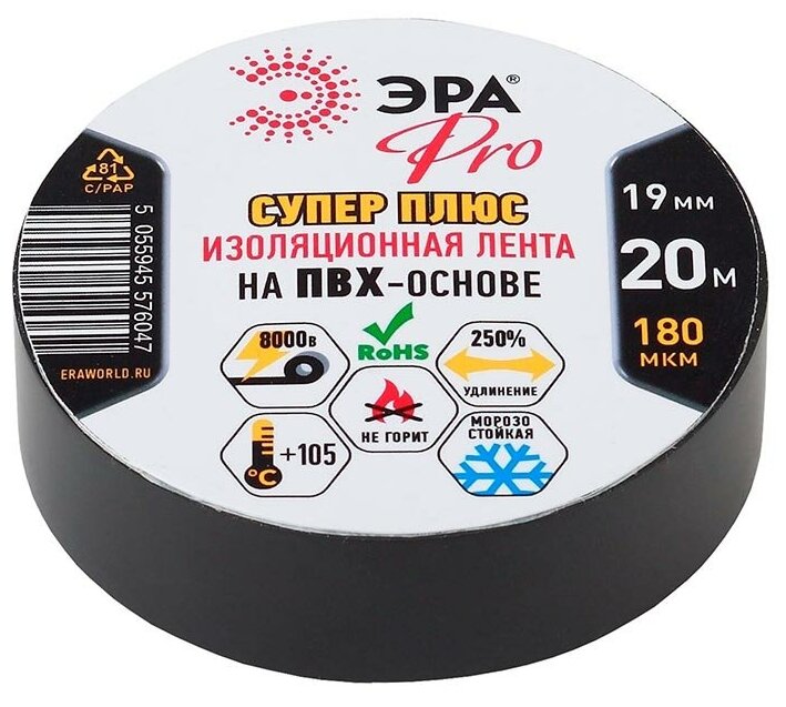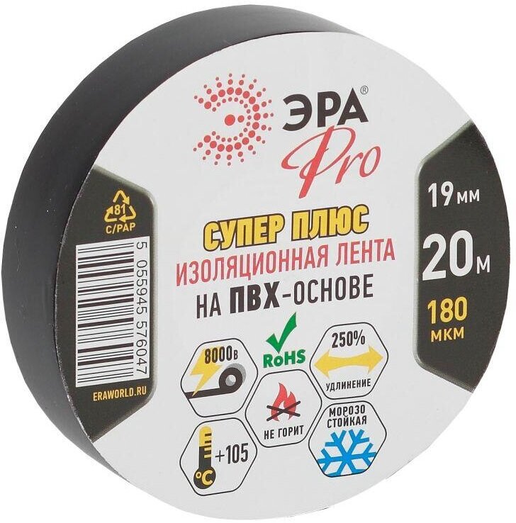 изолента ЭРА PRO ПВХ Супер Плюс 19ммх20м 180мкм черный (Б0027915)