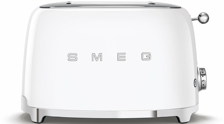Тостер ''Smeg TSF01CREU'' из серии ''Стиль 50-х''. На круглой ручке расположена шкала поджаривания. Вращая ручку, можно выбрать одну из 6 степеней поджаривания тостов. Если результат покажется неудовлетворительным, можно продолжить цикл поджаривания с помощью функции подогрева. Когда необходимо отменить или прервать цикл поджаривания, можно нажать кнопку ''Стоп'' в центре ручки. Функция размораживания предназначена для поджаривания замороженных тостов.