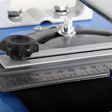 Основание ∎ усиленная стальная станина толщиной 2 мм с обрезиненной рабочей поверхностью обеспечивает высокую устойчивость инструмента при работе и неподвижность разрезаемой плитки. Трубчатые направляющие изготовлены из хромированной стали с антикоррозионным покрытием, обеспечивают свободный ход каретки в процессе резки. Градуированная выносная линейка-угольник применяется для резки плитки под углом до 45 градусов, а также регулирует размер и дополнительно фиксирует отрезаемую заготовку.