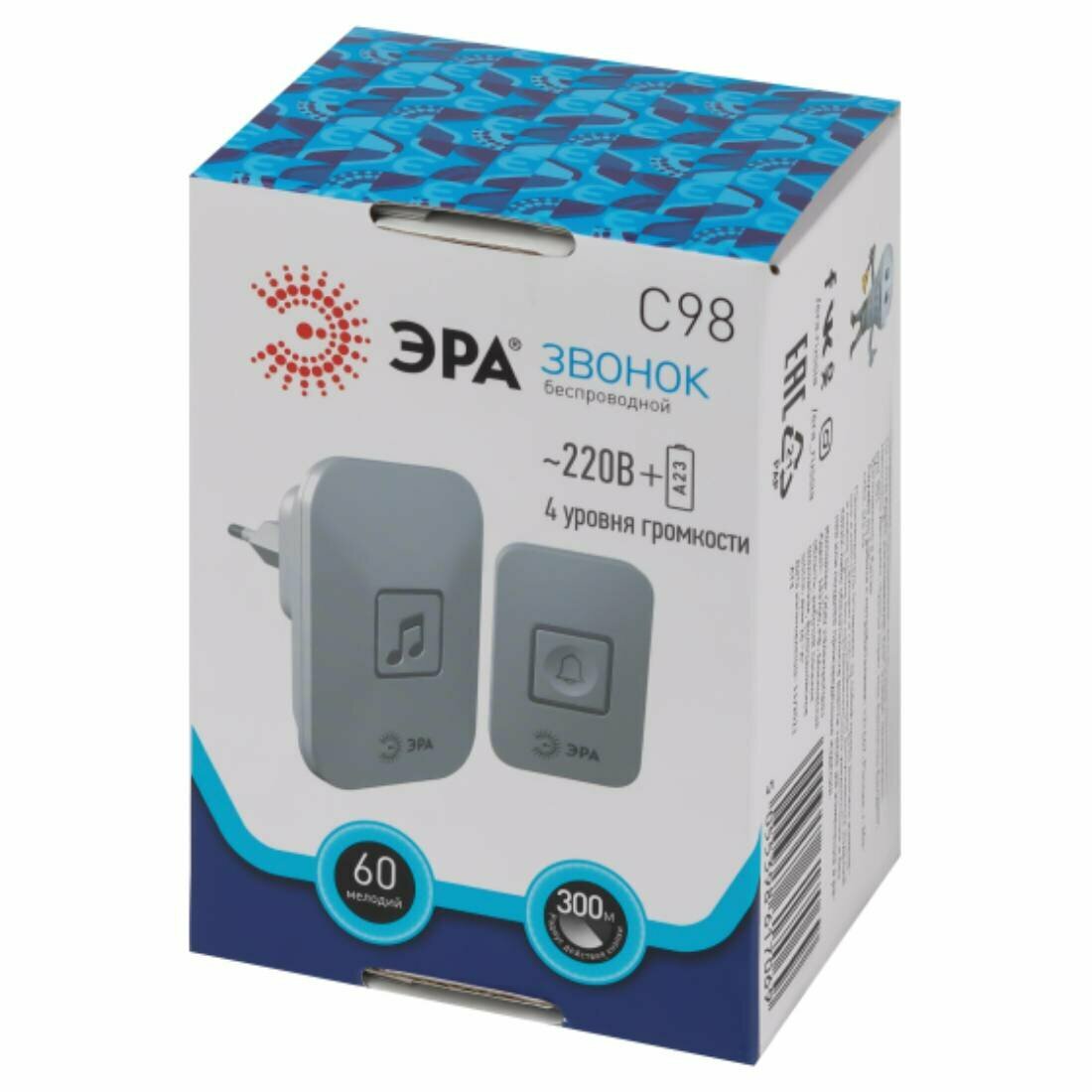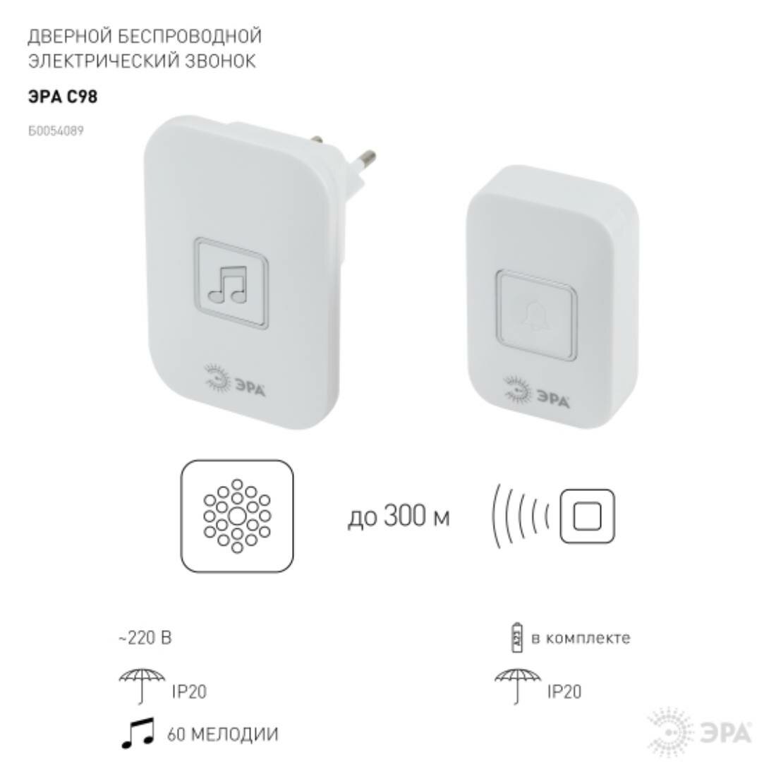 звонок беспроводной ЭРА C98 до 300м 60 мелодий белый (Б0054089)