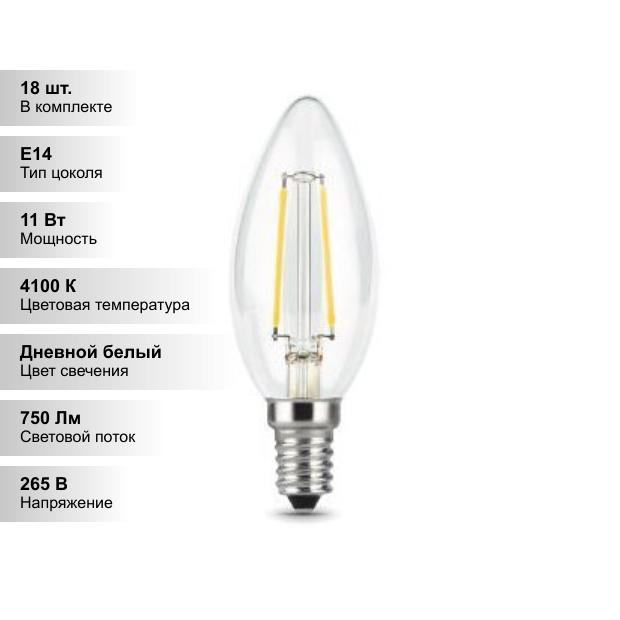 лампа GAUSS Filament Свеча 11Вт Е14 LED 830Лм 4100К (103801211)