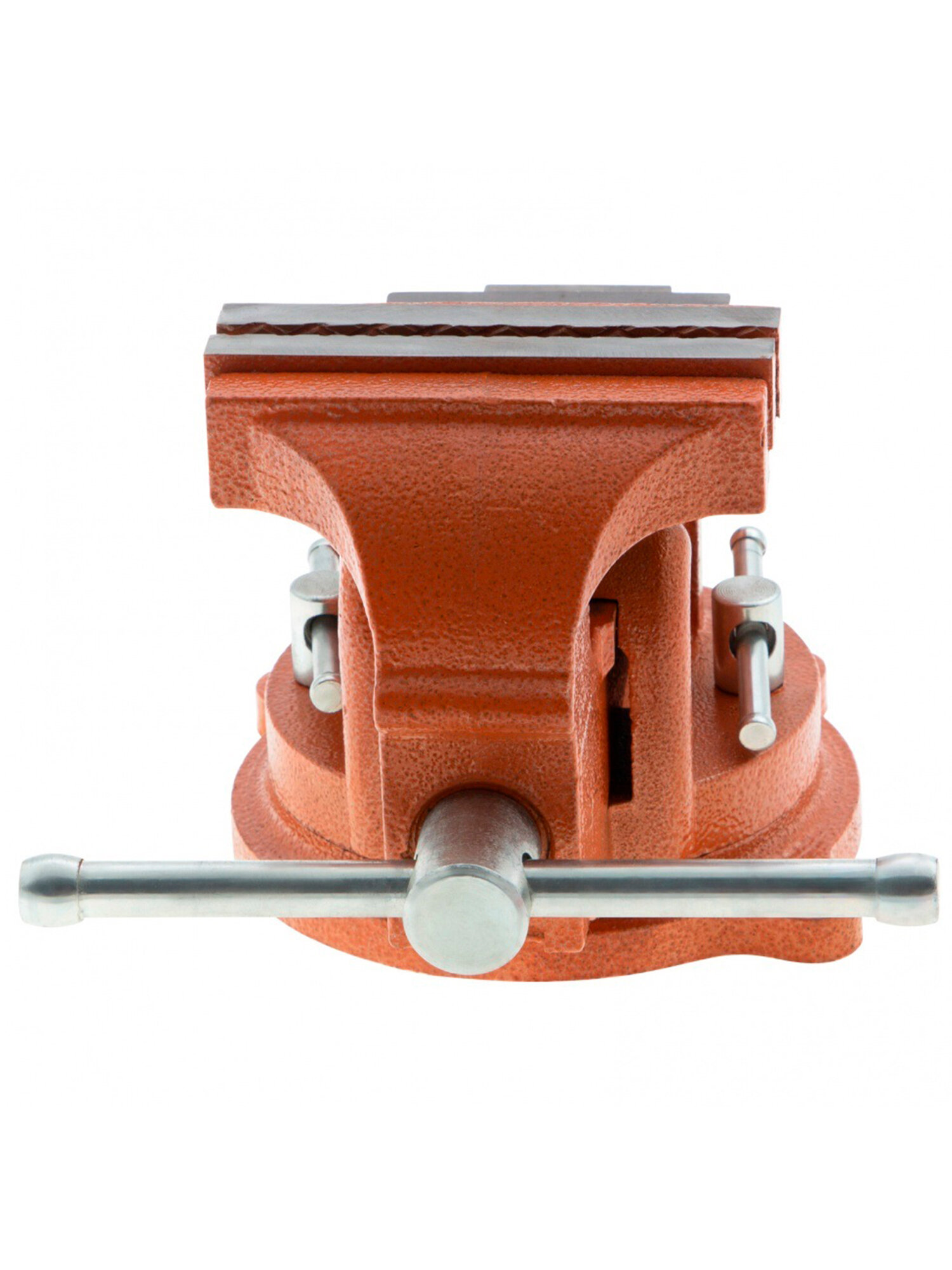 Нерабочие поверхности тисков окрашены, съемные губки выполнены рельефно, есть наковальня для проведения ударных слесарных операций. Тиски можно повернуть относительно основания, выбирая наиболее удобное положение, и закрепить. Предназначены для фиксации деталей в положении, удобном для их обработки.