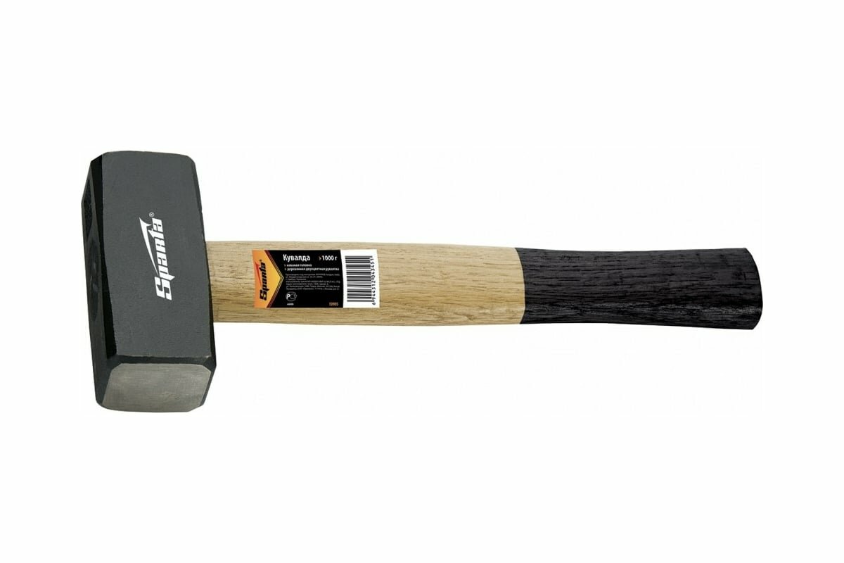 Кувалда весом 1 кг. Головка кувалды кованая, изготовлена из стали 45, покрыта черным лаком. Бойку придана селективная закалка, обеспечивающая особую твердость и прочность (52 HRc). Боек слегка выпуклый и отшлифован с обеих сторон. Деревянная рукоятка покрыта лаком для предотвращения рассыхания.
