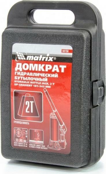 Гидравлический бутылочный домкрат Matrix 50750, в пластиковом кейсе, поднимает грузы массой до 2 т на высоту до 345 мм. За счет минимальной высоты подхвата 181 мм он оптимален для машин с большим клиренсом. Домкрат станет незаменимым помощником для автолюбителей при проведении технического обслуживания и ремонте авто в дороге или в гараже. Также он подходит для полупрофессионального применения на станциях ТО. Преимущества При превышении допустимого веса срабатывает клапан безопасности, не допускающий перегрузки и поломки домкрата. Чугунная станина и стальной корпус повышают прочность домкрата, а следовательно, и его ресурс. Корпус можно снимать со станины, такая конструктивная особенность позволяет проводить ремонт домкрата при необходимости. В комплекте идет кейс с ручками для удобства транспортировки и хранения домкрата.