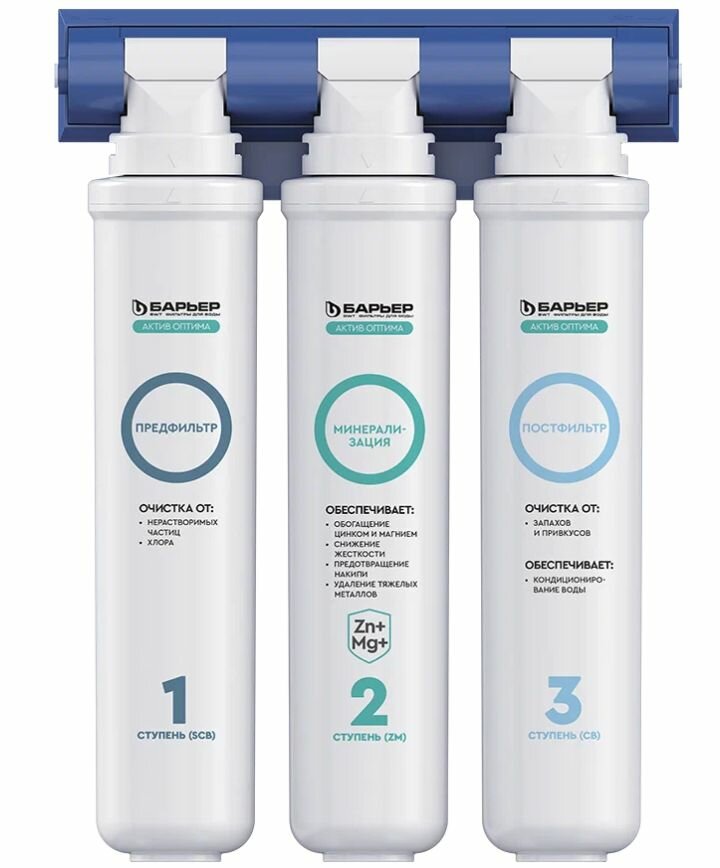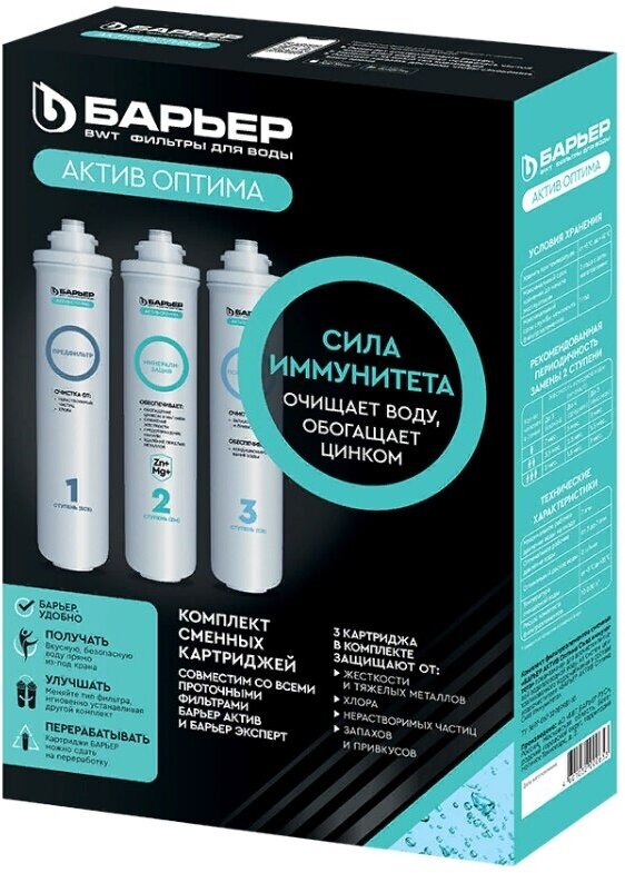 Комплект картриджей БАРЬЕР АКТИВ Оптима Сила Иммунитета предназначен для очистки и обогащения воды цинком и магнием. Коплект состоит из трех ступеней очистки: 1 ступень: Предфильтр эффективно удаляет механические примеси, хлор и хлорорганические соединения; 2 ступень: Минерализация обогащает воду цинком и магнием, удаляет тяжелые металлы и соли жесткости; 3 ступень: Постфильтр осуществляет финишную очистку и кондиционирование воды от неприятных запахов, улучшает вкусовые свойства.
