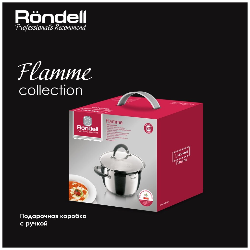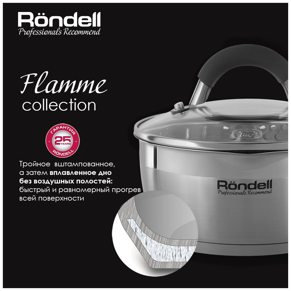 Цените товары ''2 в 1''? Серия ''Rondell Flamme'' относится именно к ним! Приобретая кастрюли этой серии, Вы не только покупаете посуду высокого качества с особым дном, позволяющим быстро и качественно готовить, но и освобождаете место, которое ранее на Вашей кухне занимал дуршлаг - удобные отверстия на крышке и специальный носик позволяют слить воду тогда, когда это Вам нужно. Изысканный классический дизайн и термоустойчивые силиконовые ручки помогут Вам не только безопасно пользоваться такой посудой, но и делать это с удовольствием. Получайте наслаждение от настоящей готовки вместе с ''Rondell Flamme''.
