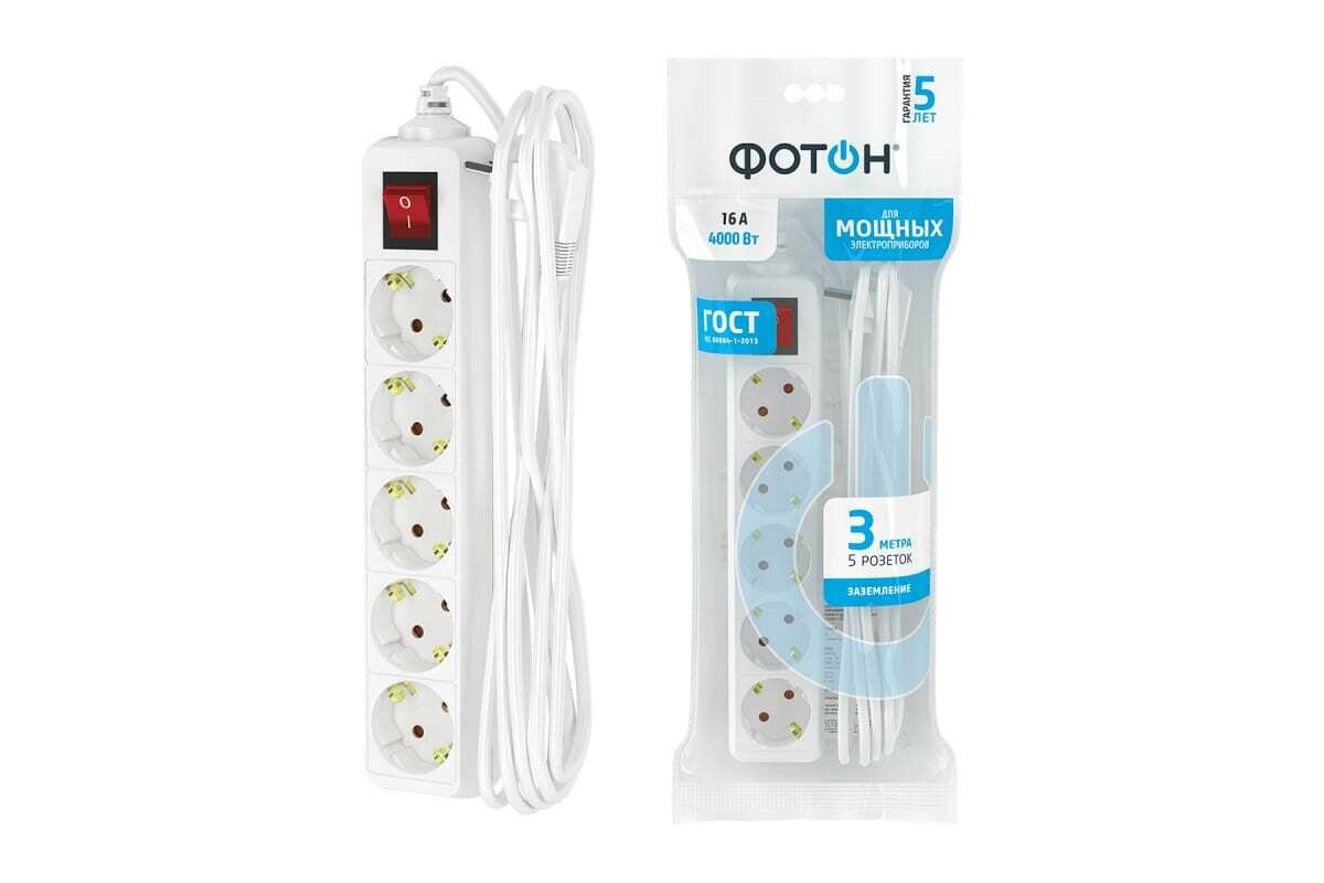 удлинитель 3м 5-местный с/з с выключателем 16А для офиса 16-35ЕS белый ФОТОН (21208)