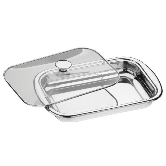 Изготовлено из высококачественной особо прочной нержавеющей стали 18/10. Подходит для запекания, подачи и хранения. В посуде из такой стали можно хранить и готовить любые продукты, в том числе содержащие щелочи и кислоты, так как она не вступает в контакт с пищей, не изменяет ее вкус, запах и цвет. Стильный дизайн с зеркальной, придающей изысканность полировкой, позволяет эффектно подать блюдо к столу. Крышка из огнеупорно стекла с повышенной сопротивляемостью к механическим воздействиям. Модель имеет небольшие выемки по бокам для удобства переноски. При производстве особое внимание уделяется окончательной обработке, что предохраняет от риска пораниться о края изделия. Индивидуальная упаковка. Можно мыть в посудомоечной машине.