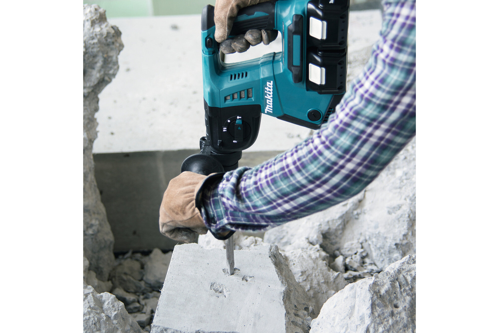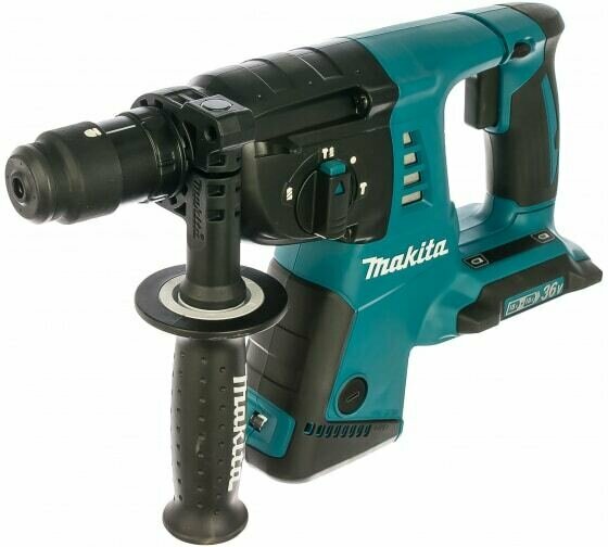 | Прочие особенности и свойства | Уникальный электроинструмент для работы в трёх режимах - долбление, безударное и ударное сверление. Питание - от двух литиевых аккумуляторов суммарным напряжением 36 В. Электронная регулировка скорости, расщепляющаяся муфта, подсветка рабочей зоны. Патрон - быстрозажимной. Перфоратор Makita DHR264Z – этот универсальный инструмент, способный работать не только в режиме долбления, но ударного и безударного сверления. В последнем случае им можно просверлить в стальном листе отверстие до 13 мм, а в дереве или другом мягком материале – до 3,2 см. Компактная конструкция (длина – 35 см) обеспечивает надёжное удержание в руках и демпфирование вибраций, а дополнительную рукоятку из комплекта поставки можно установить в любом удобном положении. И весит инструмент Makita DHR264Z совсем немного, всего 4,7 кг, так что работать с ним можно, не уставая, длительное время. Аккумуляторами перфоратор не комплектуется, но можно отметить, что их зарядка не займёт много времени, потребуется всего 22 мин. |