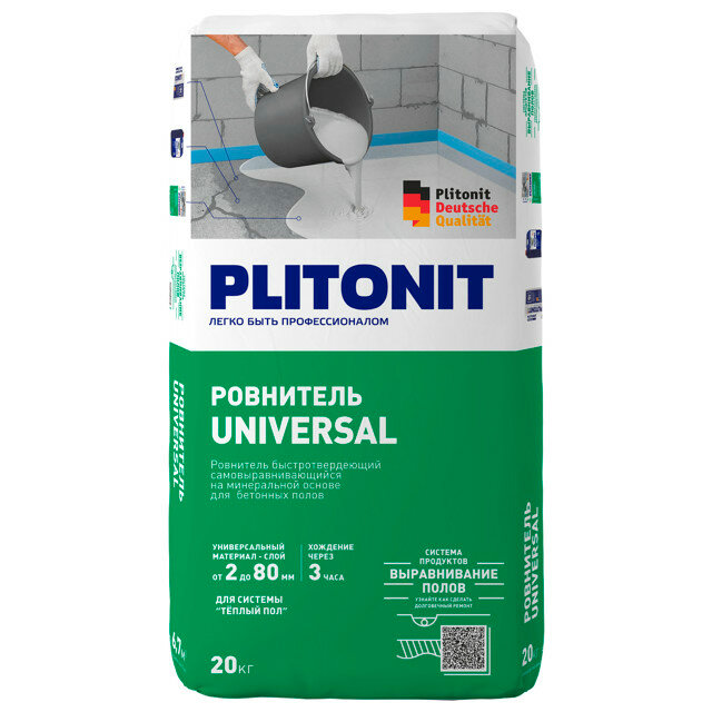 Ровнитель быстротвердеющий самовыравнивающийся на минеральной основе для бетонных полов. Предназначен для выравнивания и корректирования бетонных полов и монолитных цементных и полимер-гипсовых стяжек, внутри сухих и влажных жилых (конторских) помещений ручным и машинным способом нанесения, под укладку напольной керамической плитки, выстилающих покрытий, паркета и использования в системе ''теплый пол''.