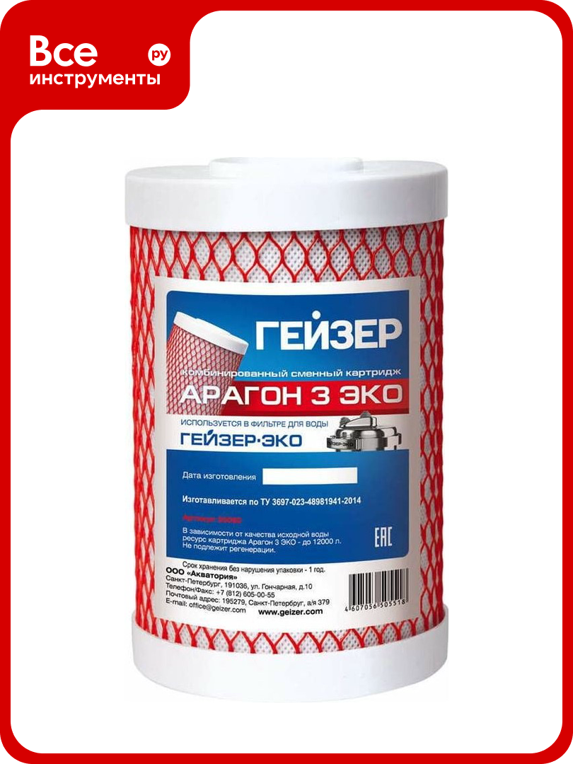 Композитный картридж на основе материала Арагон и карбон-блока. 3 стадии очистки: механическая, ионообменная и сорбционная. Состоит из предфильтра, материала Арагон и карбон-блока. Применяется в фильтре ''Гейзер Эко'' для комплексной очистки воды с низким и средним уровнем минерализации. Картридж ''Арагон 3 Эко'' служит для очистки водопроводной воды от хлора, тяжёлых металлов, железа, нефтепродуктов, механических частиц и др. нежелательных примесей. Жесткость воды снижается до уровня полезного для человека.