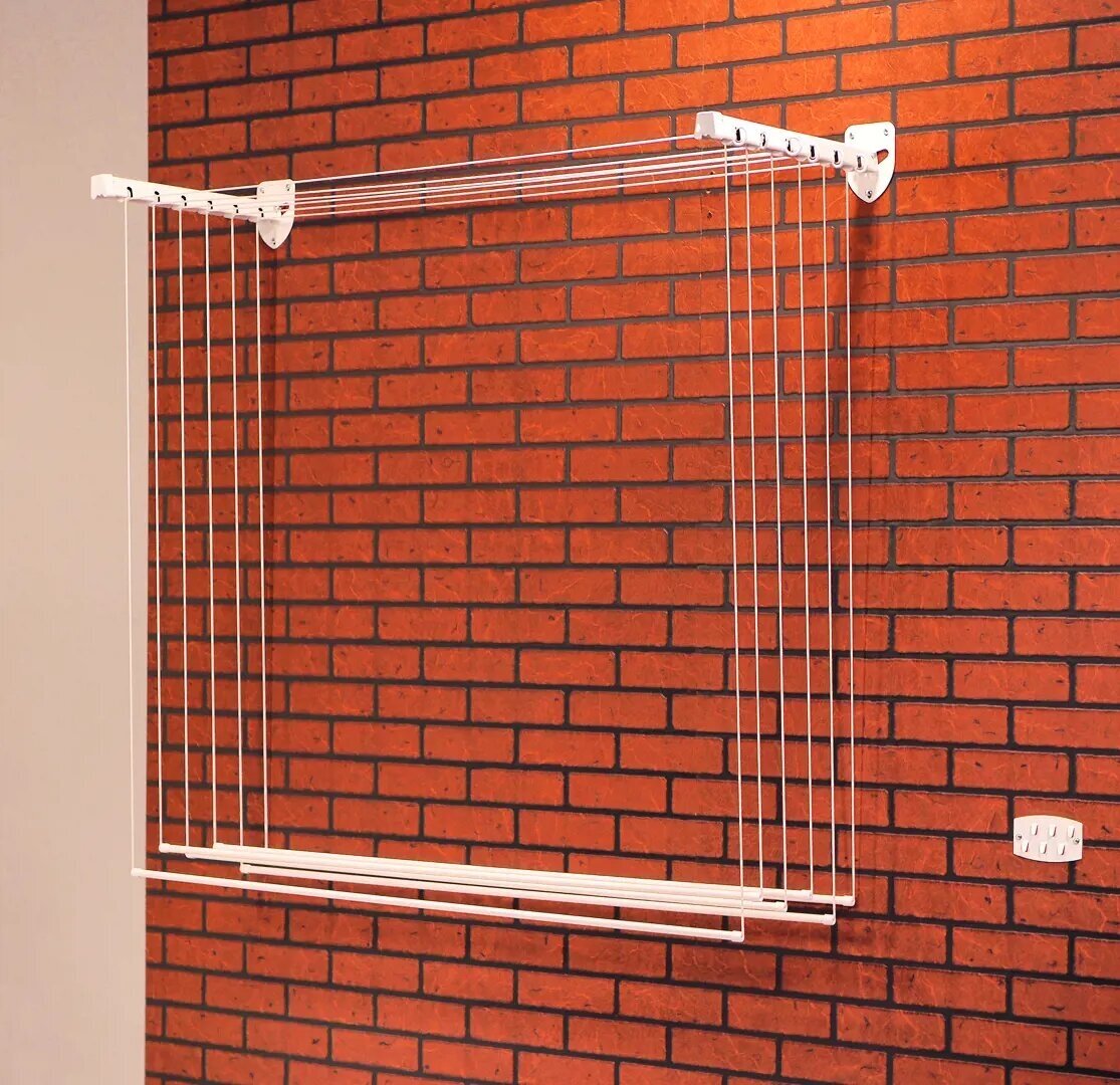 Сушилка настенно-потолочная раздвижная имеет рабочую поверхность длиной 9.6 м, но при очень компактная и занимает совсем мало места. Сушилка крепится на стену и потолок и имеет 6 подвесных трубок на веревках. Максимальная нагрузка - 12 кг. Размер сушилки можно регулировать, выдвигая лишь нужные части. В комплекте идет трубка манипулятор.