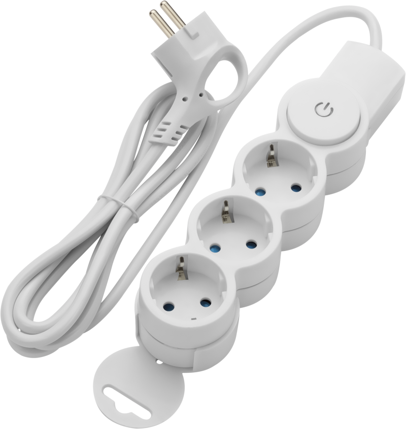 Бытовой удлинитель с заземлением и выключателем, имеет корпус белого цвета. Позволяет подключить в электрическую сеть одновременно три прибора. Длина провода - 2 метра. Максимальный ток нагрузки составляет 10 А, максимальная подключаемая мощность - 2200 Вт.