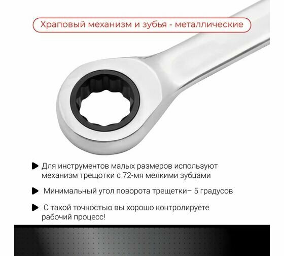 Комбинированный ключ ''Vira'' с храповым механизмом оснащен трещоткой, что позволяет Вам работать с креплением, не снимая инструмент с гайки после каждого рабочего движения. Ключ отводится назад механизмом обратного движения трещотки. В инструменте совмещены рожковый открытый ключ и накидной закрытый ключ. Для инструментов малых размеров используют механизм трещотки с 72-мя мелкими зубцами. Её минимальный угол поворота - 5°. С такой точностью Вы хорошо контролируете рабочий процесс. Ключ имеет овальное сечение, поэтому меньше натирает ладонь и пальцы во время работы. Храповой механизм и все зубья - металлические. Поверхность ключа зеркально отполирована. Помимо антикоррозийного эффекта, полировка привлекает к ключу внимание, когда он лежит среди прочих инструментов.