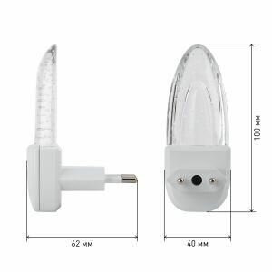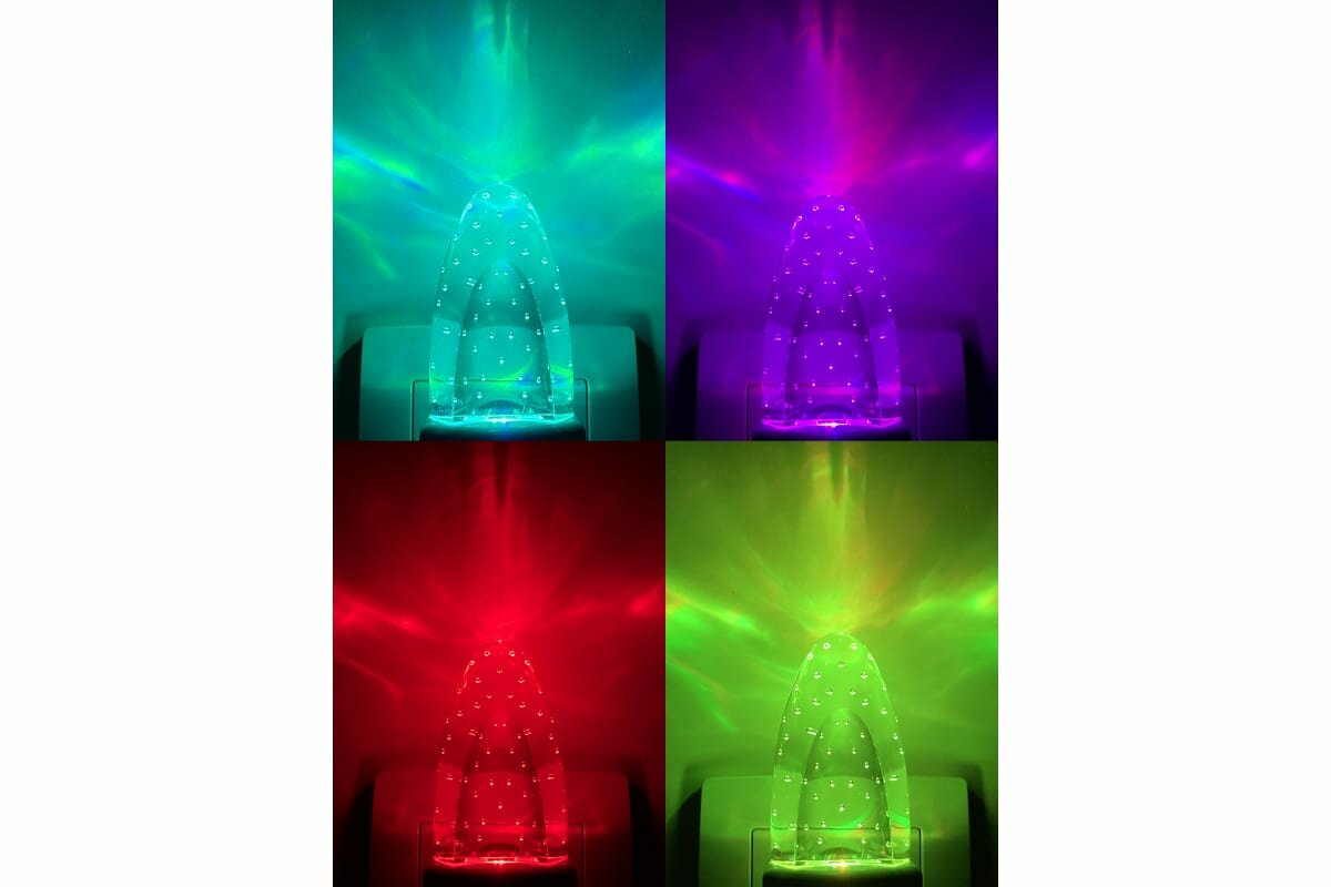 Светодиодный светильник-ночник с датчиком освещенности (включается автоматически, когда становится темно). Источник света - цветной RGB светодиод, свет с плавными переходами цветов. Прозрачная часть ночника, похожая на кристалл, подсвечивается разноцветным переливающимся светом при включении. Питание от сетевой розетки 220 В.