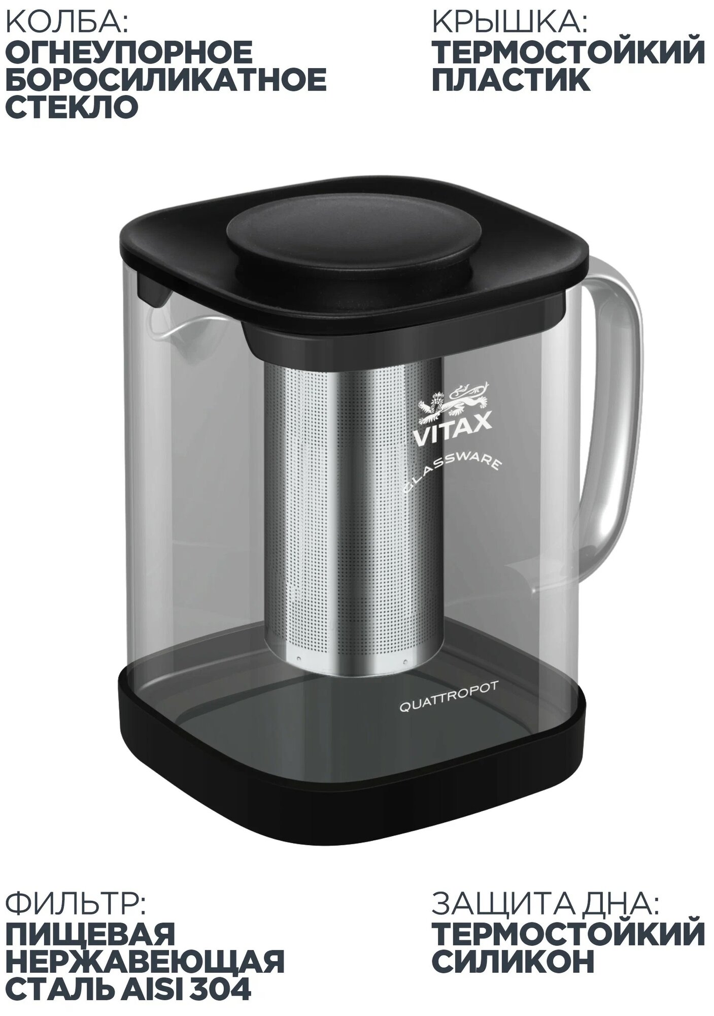 Чайник заварочный ''Vitax Thirlwall'' - это мультифункциональный заварочный чайник ''4 в 1'' эргономичной квадратной формы. Может служить как наплитный заварочный чайник, наплитный кофейник, заварочный чайник для чая, заварочный чайник для кофе. Изготовлен из особо прочного, боросиликатного термостойкого стекла, позволяющего использовать колбу на газовых и электрических плитах. Легкосъёмная крышка из пищевого пластика, имеет удобную систему извлечения фильтра. Легкосъёмная защитная подставка выполнена из термостойкого пищевого силикона. Контейнер-фильтр изготовлен из пищевой нержавеющей стали 18/10. Подходит для мытья в ПММ.