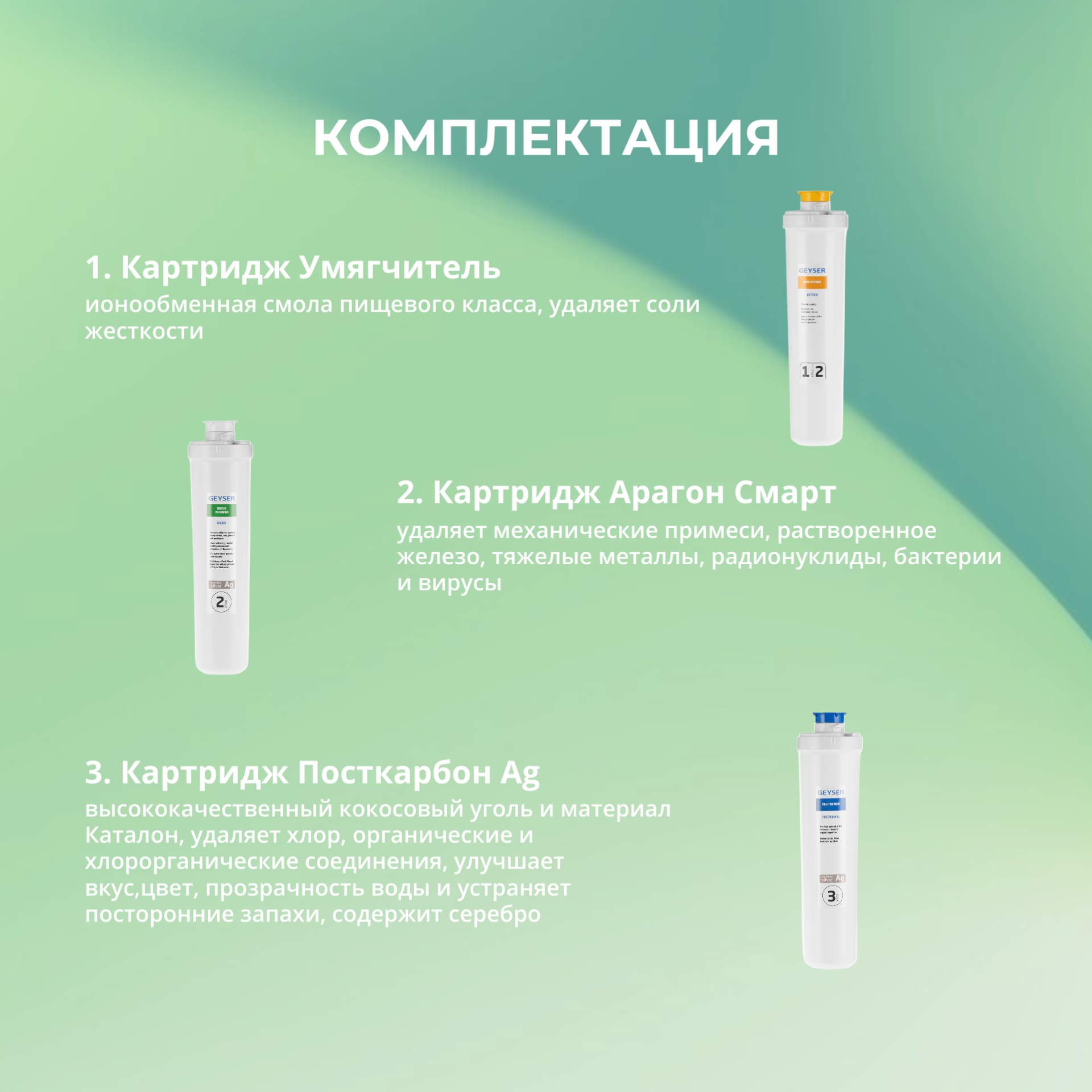| Комплектация | умягчитель, картридж Арагон, картридж Посткарбон Ag |