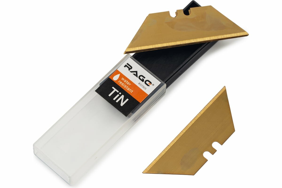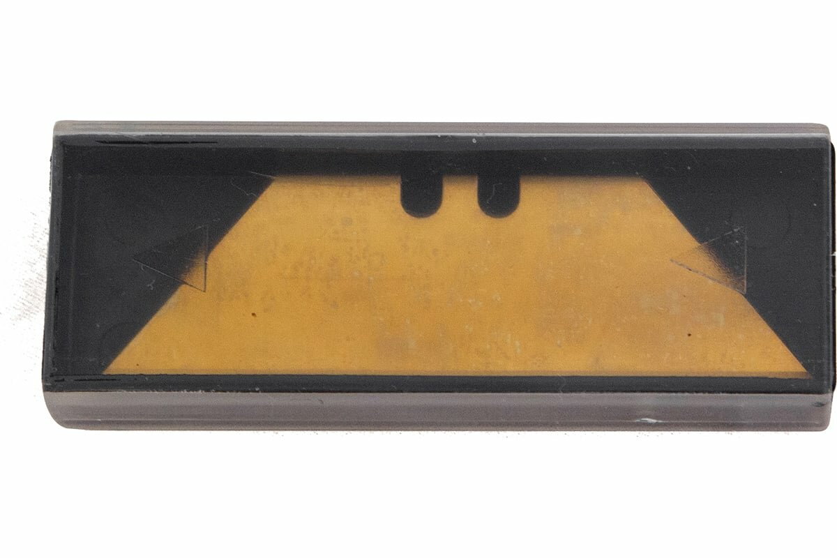 Трапециевидные лезвия имеют цельную структуру, поэтому способны выносить большие нагрузки, чем сегментированные лезвия. Справляются не только с бумагой, картоном, пленкой, тканью, пластиком, но и с ковровым покрытием, фанерой до 6 мм, выдерживают ударные нагрузки по дереву. Набор состоит из 5 лезвий, выполненных из инструментальной стали с титановым покрытием, защитщающим от коррозии. Лезвия не предназначены для повторного использования и заменяются целиком, но используются обе его стороны.