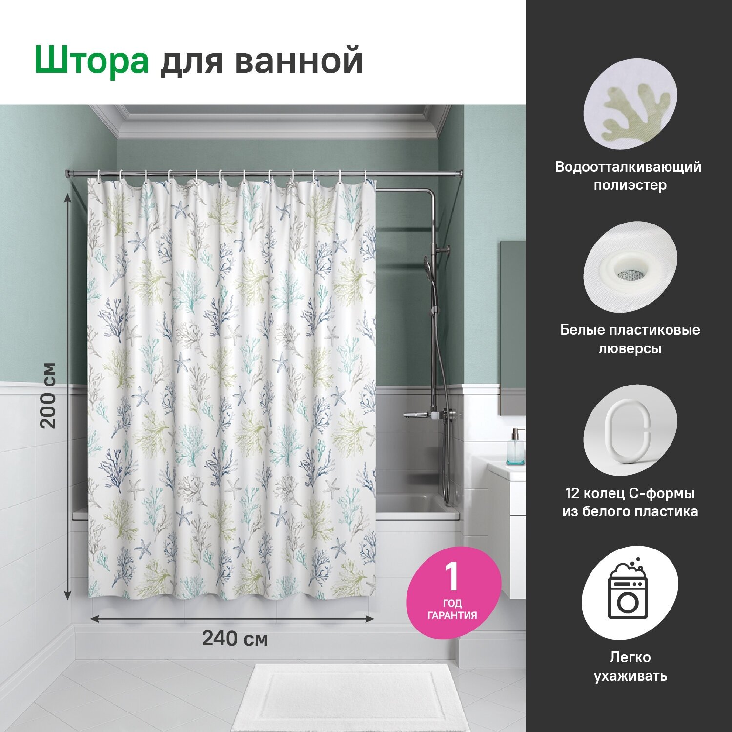 Изготовлена из 100 % полиэстера, фактура материала с эффектом тиснения. Это обеспечивает прочность изделию и легкость ухода за ним. Имеет водоотталкивающую пропитку, которая позволяет шторе надежно защищать ванную от воды во время приема душа. Быстро высыхает. Оснащена 12 отверстиями с люверсами белого цвета для колец. В комплект входит 12 белых колец.