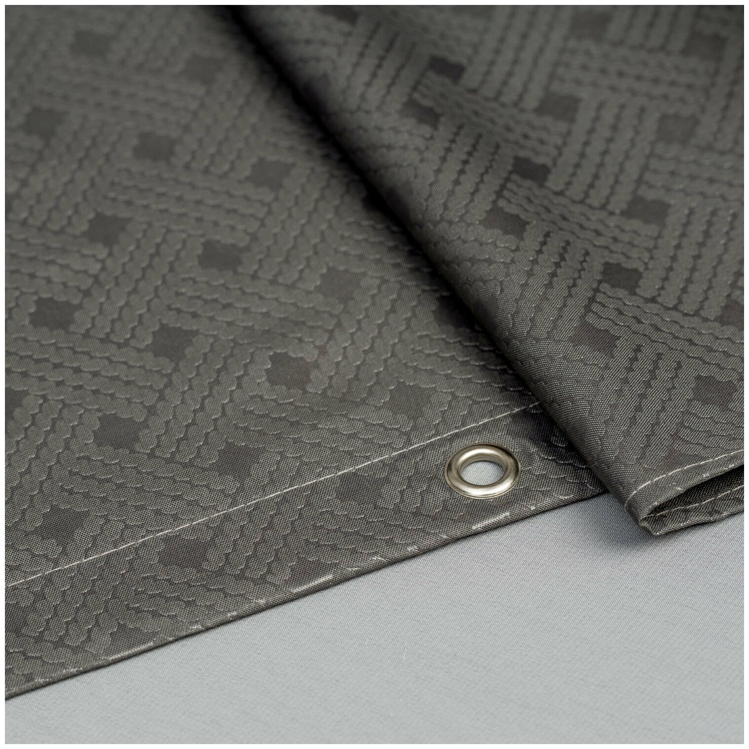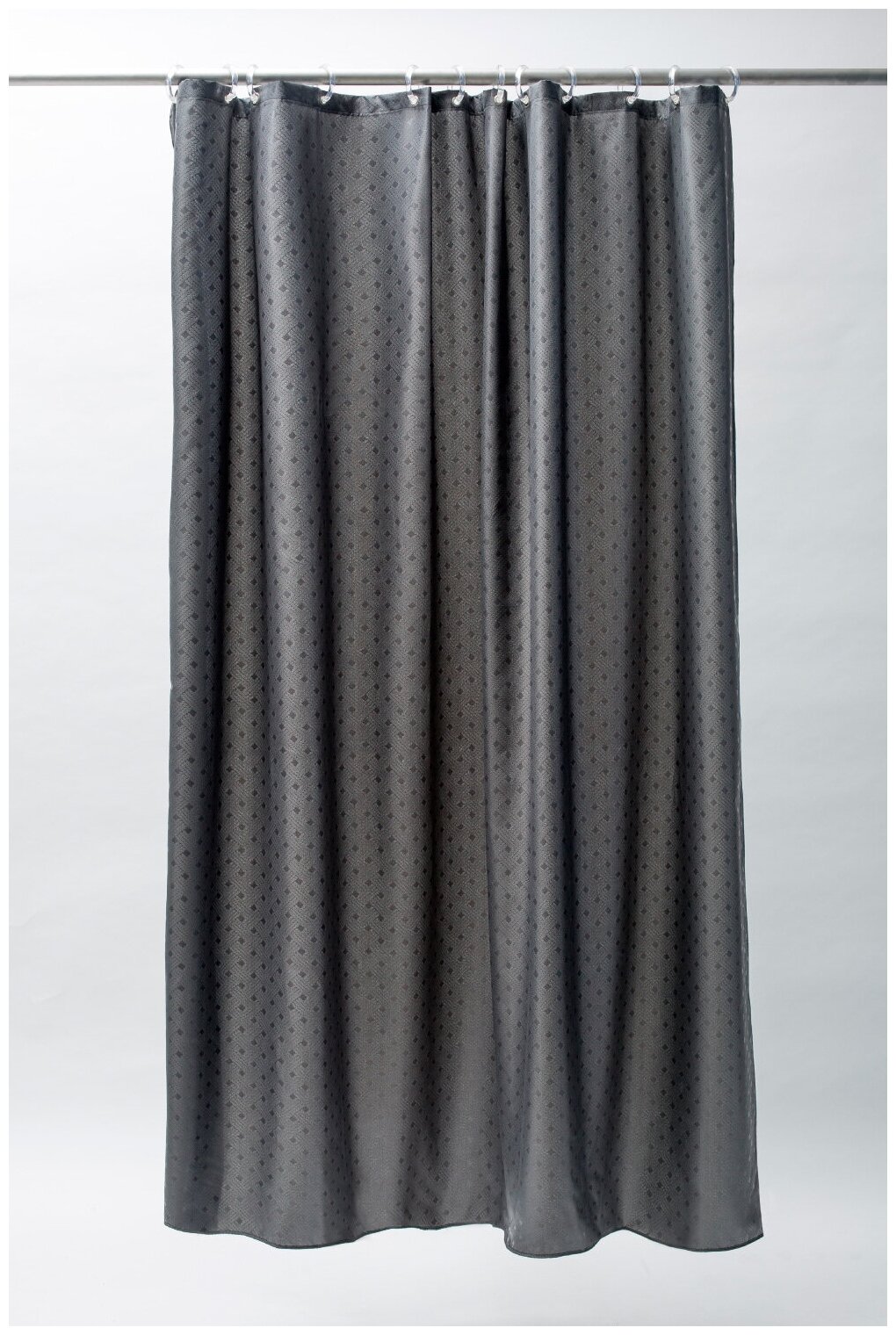 Изготовлена из 100 % полиэстера, фактура материала с эффектом тиснения. Это обеспечивает прочность изделию и легкость ухода за ним. Имеет водоотталкивающую пропитку, которая позволяет шторе надежно защищать ванную от воды во время приема душа. Быстро высыхает. Оснащена 12 отверстиями с металлическими люверсами для колец. В комплект входит 12 прозрачных колец.