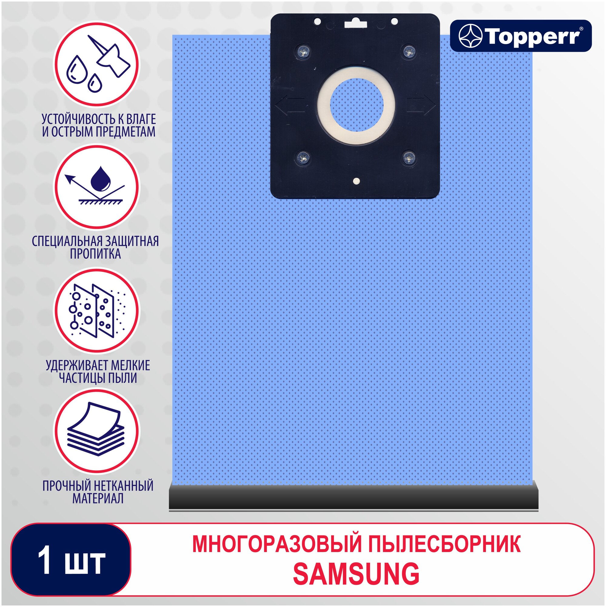 Многоразовый синтетический пылесборник для пылесосов ''Samsung''. Изготовлен из плотного синтетического полотна, способность задерживать 99% пыли. Пылесборник обработан специальным антимикробным составом, который препятствует размножению микробов и бактерий.