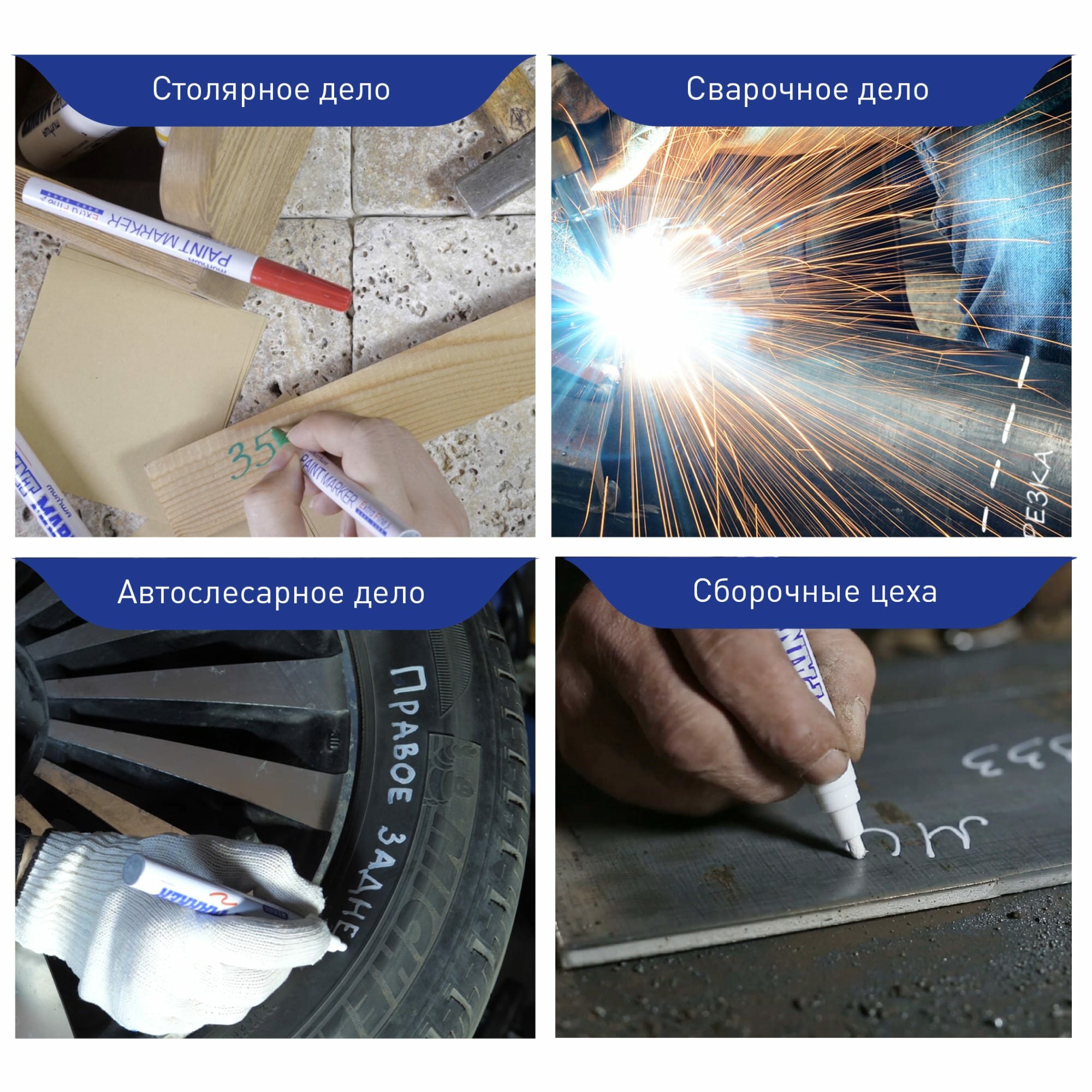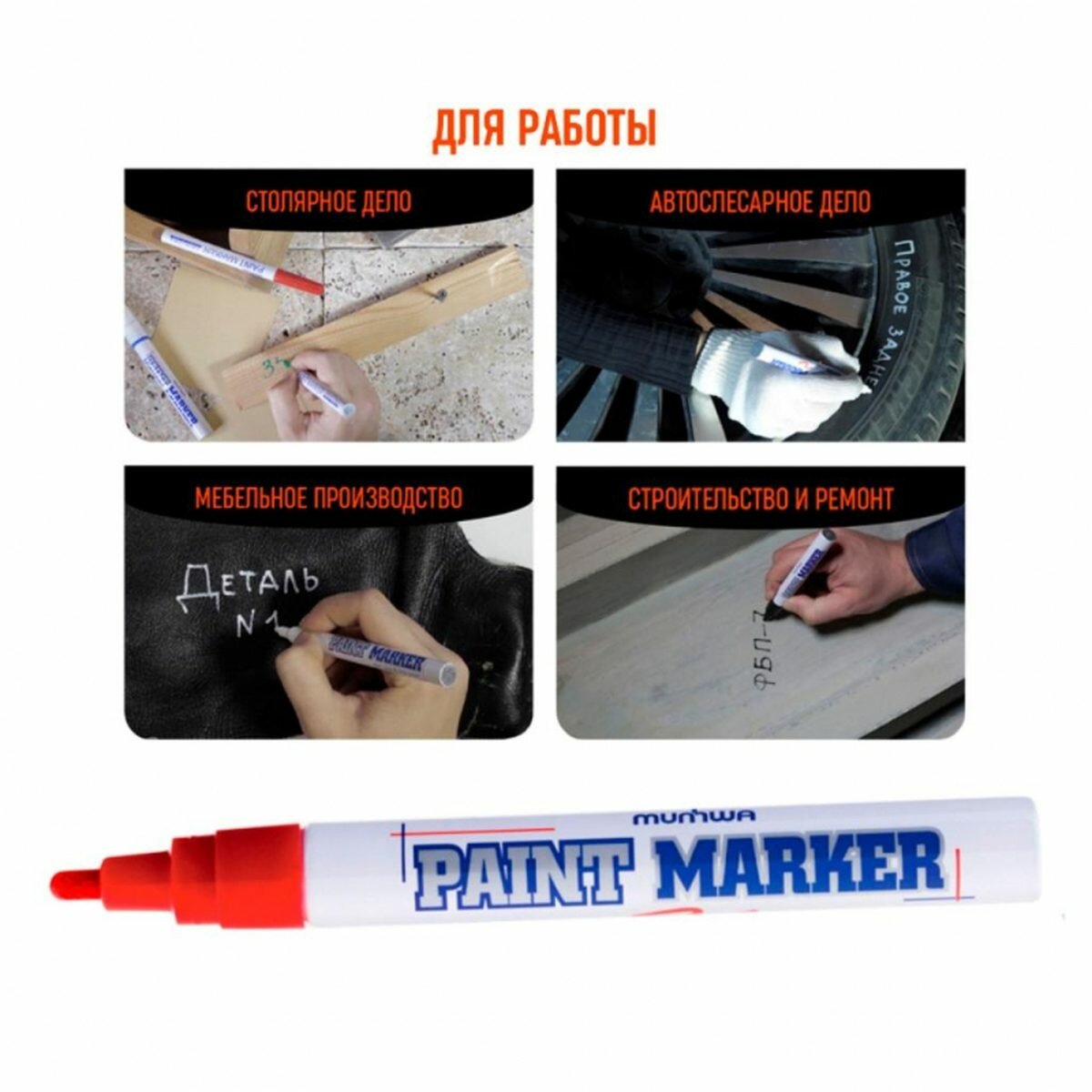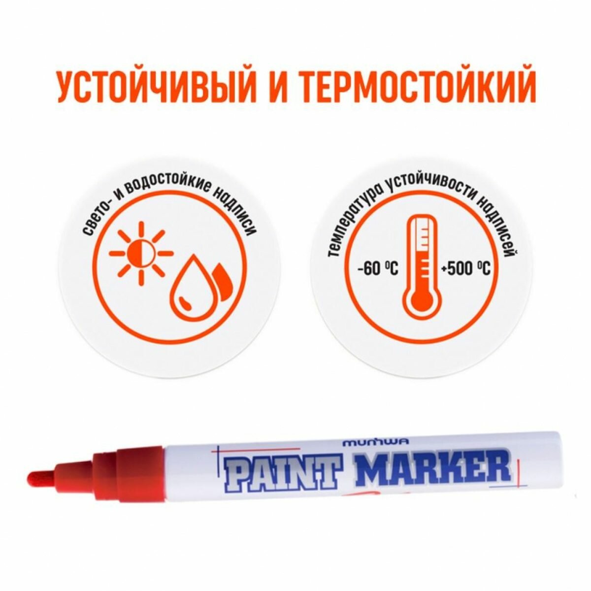 Красный маркер-краска ''Munhwa Paint Marker'' с пулевидным пишущим узлом подходит для маркировки различных изделий и сборных грузов. Благодаря нитро-основе чернила после нанесения высыхают за 1,5 минуты и не стираются. Маркер имеет широкий ёмкий металлический корпус, контрастное чёткое письмо на любых поверхностях (металле, пластике и ПВХ, резине и шинах, асфальте, бетоне, камне и кирпиче, дереве, стекле, плитке, коже, бумаге, ткани и пр). Линия водостойкая и светоустойчива. Пишет на охлаждённой и нагретой поверхности от -15 до +130 град, а также на ржавой, мокрой, грязной, шершавой, пористой, промасленной и жирной. Толщина линии: 4 мм. Длина письма: 350 м. Температура использования маркера: от -15 до +50°С. Длительный срок годности 5 лет.