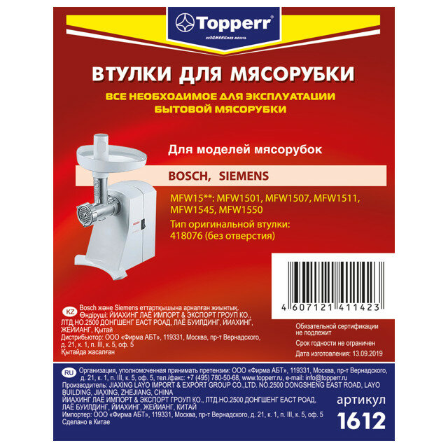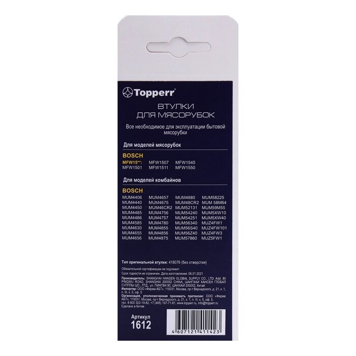 втулка для мясорубок TOPPERR 1612 д/Bosch Siemens