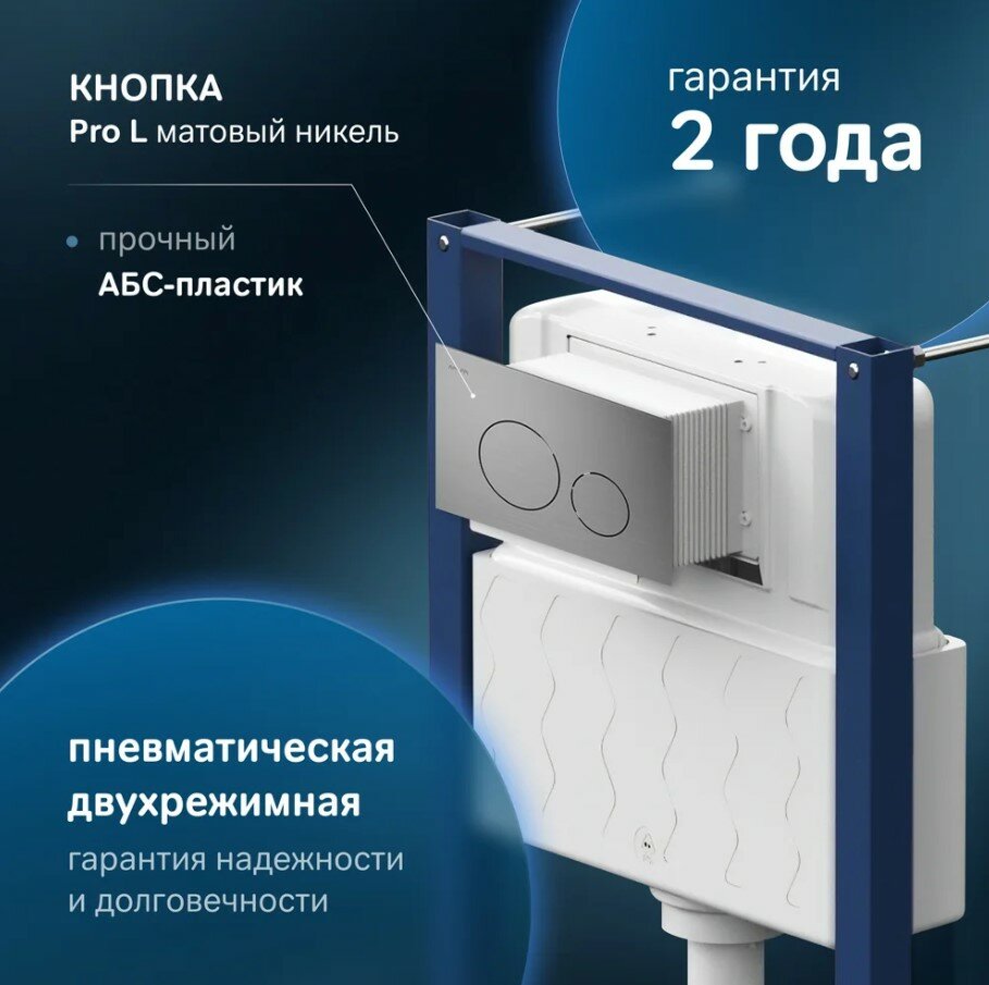Максимально полная комплектация - все необходимые крепления, патрубки, звукоизолирующая прокладка в комплекте. Вертикальные ребра жесткости в конструкции рамы - дополнительная опора в месте давления керамики на стену. Благодаря им инсталляция более универсальная и подходит для унитазов любых размеров, включая унитазы с небольшой контакной поверхностью. Нет необходимости докупать дополнительные аксессуары для монтажа таких унитазов. Благодаря цельному стальному профилю 40х40 мм толщиной 2 мм инсталляция выдерживает нагрузку до 400 кг. Цельный бесшовный бачок из полиэтилена с защитой от конденсации. Комфортное использование благодаря заливному клапану с низким уровнем шума - менее 20 Дб.