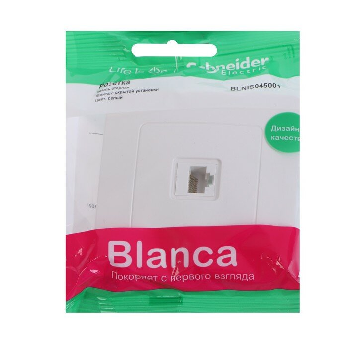 **Розетка компьютерная** серии BLANCA Systeme Electric (ранее Schneider Electric) предназначена для удобного и быстрого подключения устройств к сети Интернет. Изделие поставляется в сборе с рамкой и предназначено для скрытой установки в стену.