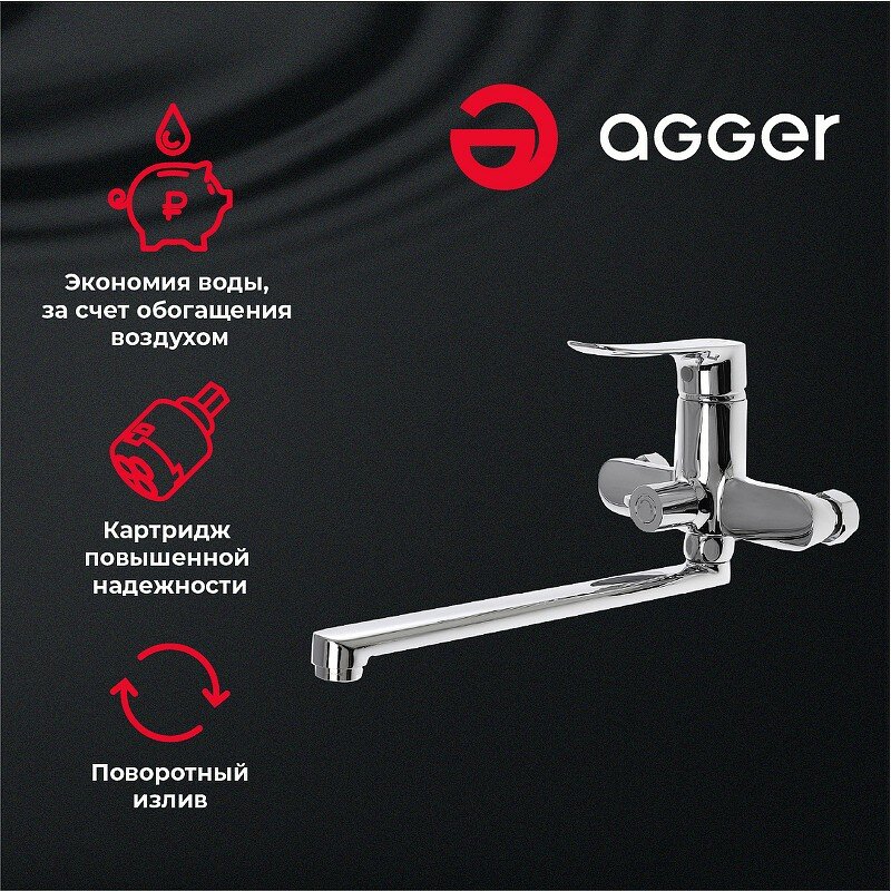 Смеситель ''Agger Nice A2521100'' подойдет для тех, кто выбирает качественное и надежное оборудование для ванной комнаты. Длинный поворотный излив позволяет использовать модель как для раковины, так и для ванны. Фирменный картридж ''Agger'' делает легким управление напором и температурой воды, а керамический дивертор переключит поток с излива на душ даже при низком давлении. Аэратор, насыщающий струю воздухом, существенно сокращает расход воды. В комплекте - душевой набор: ручная лейка (1 режим), душевой шланг в металлической оплетке (150 см) и настенный держатель.