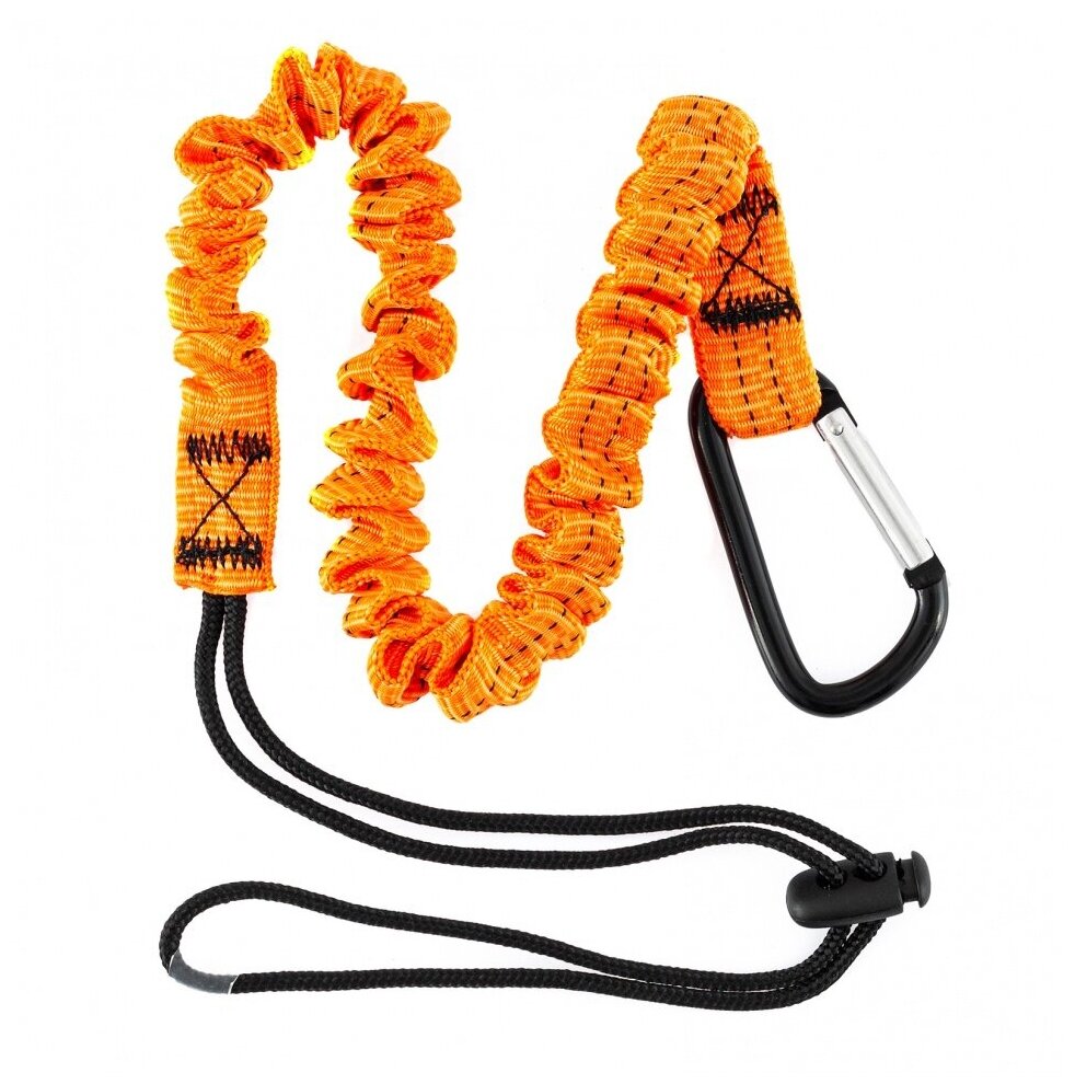 Страховочный шнур предназначен для фиксации инструмента на поясе или элементах снаряжения для предотвращения утери при проведении высотных работ. Прочный нейлоновый шнур длиной 80 см может растягиваться до 110 см. Отличается яркой оранжевой расцветкой. Стальной карабин для надежной фиксации. Максимальная грузоподъемность: 10 кг.