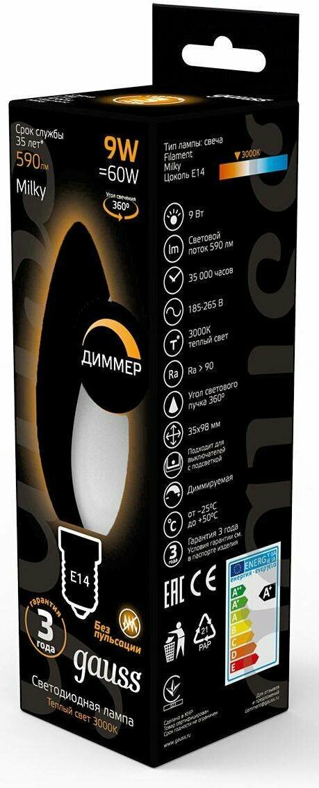 лампа филаментная GAUSS 9Вт Е14 LED 590Лм 3000К milky свеча (103201109)