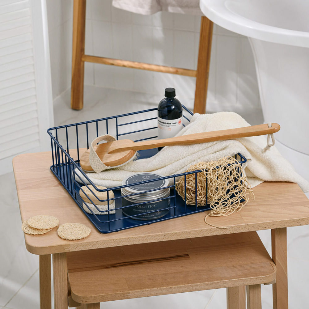 Органайзер настольный, изготовлен из прочного материала с устойчивым покрытием. Полимерное покрытие защищает от коррозии и щелочей в составе косметических средств и бытовой химии. Аккуратно обработанные края и швы облегчают уход за изделием. Высокий бортик препятствует выпадению содержимого. Классическая квадратная форма и износоустойчивые материалы делают органайзер универсальным аксессуаром как для ванной и кухни, так и рабочего стола.