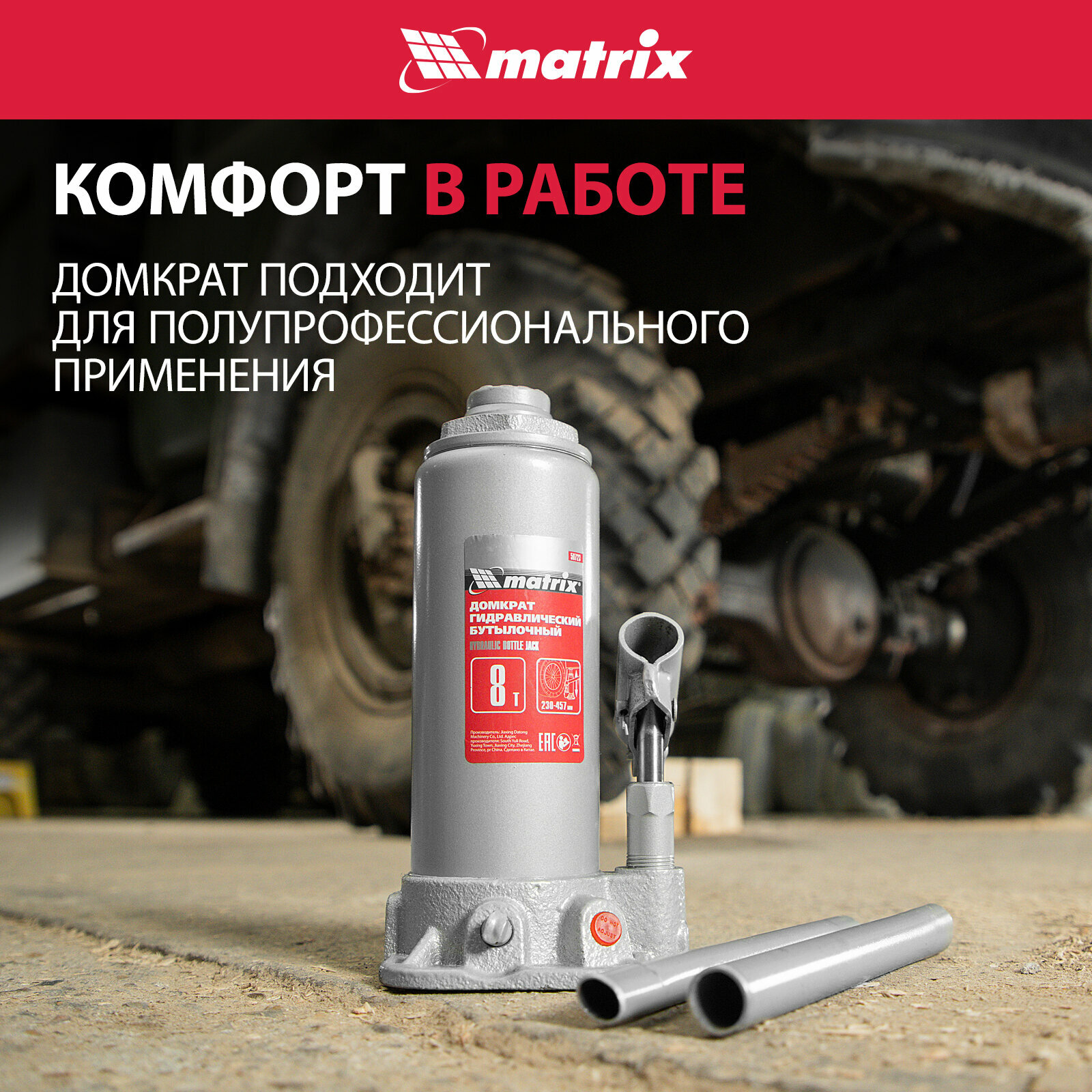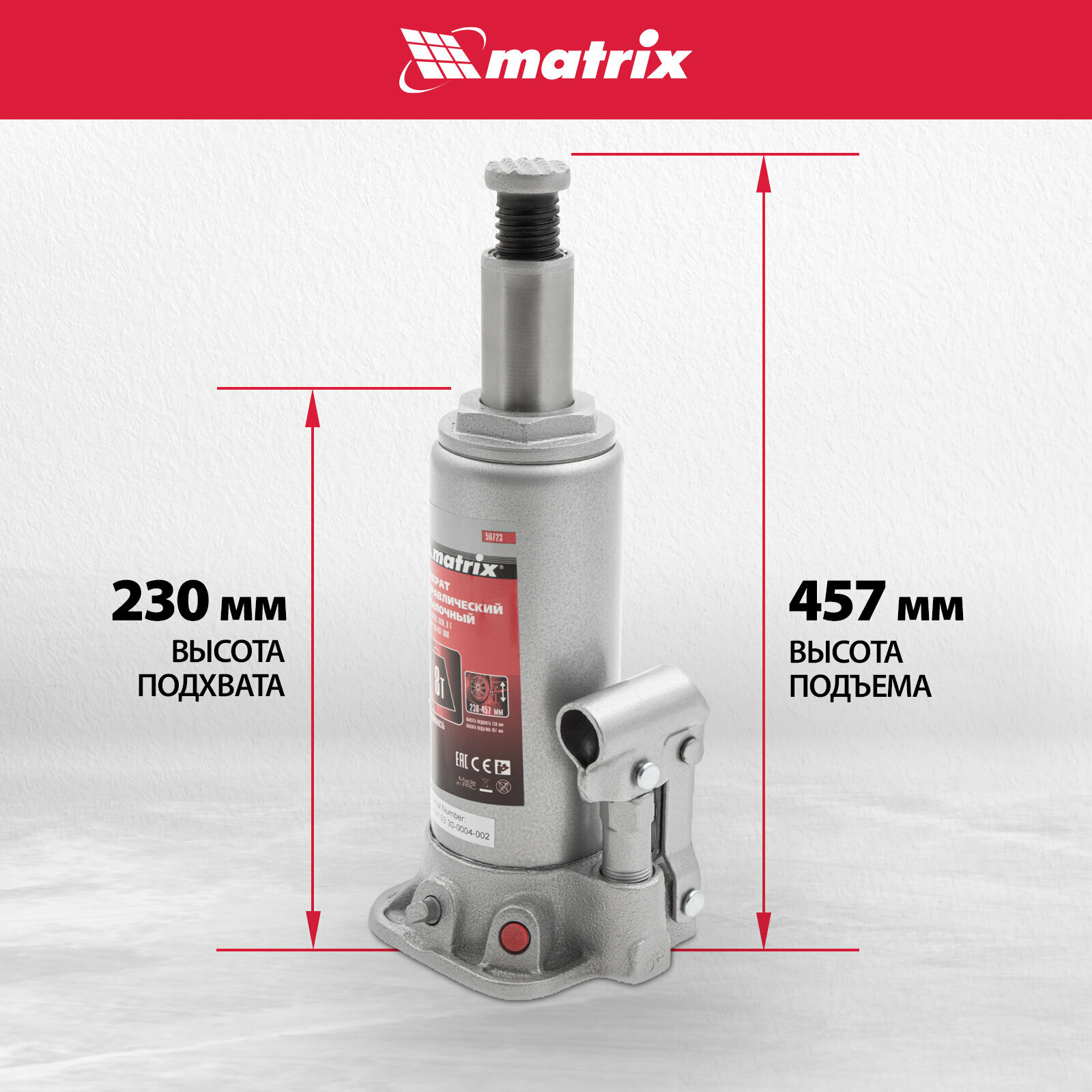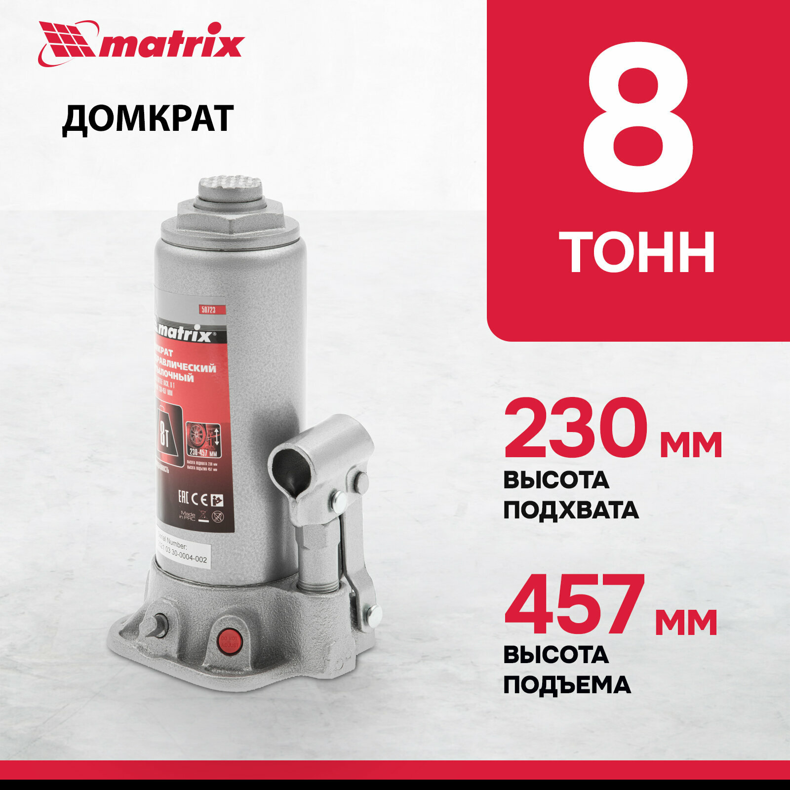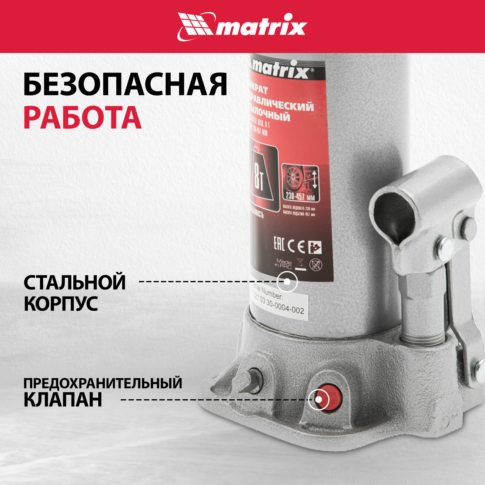 Гидравлический бутылочный домкрат Matrix 50723 используется для поднятия и фиксации грузов весом до 8 т на высоту 230-457 мм. Он подходит для автомобилей с высоким клиренсом. Домкрат станет незаменимым помощником для автолюбителей в гараже и дороге, а также для профессионалов на СТО. Преимущества Защиту от перегрузок обеспечивает клапан безопасности, не допускающий поднятия веса более допустимого. Чугунное основание и стальной корпус гарантируют надежность домкрата. Резьбовое соединение основания и корпуса обеспечивает возможность ремонта конструкции при необходимости.