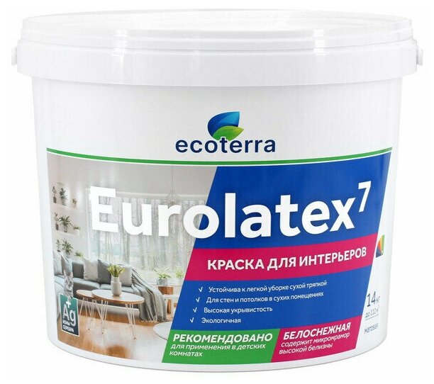 Акриловая интерьерная краска EUROLATEX 7 предназначена для окраски стен и потолков внутри помещений с нормальной влажностью по кирпичу, бетону, газобетону, штукатурке, шпатлёвке, а также по гипсокартонным плитам, дереву, ДВП, ДСП и обоям под покраску. Паропроницаемое (∎дышащее∎) покрытие краски устойчиво к уборке при помощи сухой тряпки. После высыхания образует ровную матовую ∎дышащую∎ поверхность. Экологически чистая, содержит с своем сосотаве ионы серебра и микромрамор высокой белизны. Легко наносится, быстро высыхает, без резкого запаха, не желтеет.