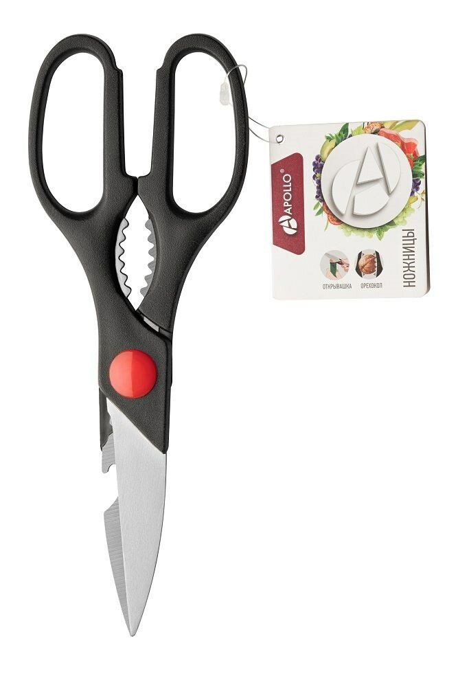 Ножницы предназначены для бытового использования. На одном из лезвий находятся открывалка для банок/бутылок и рыбочистка, а на рукоятках ножниц находится орехокол. Размер изделия 7,5*1,5*20,8 см. Материал изготовления: нержавеющая сталь 2Cr13, пластик PP