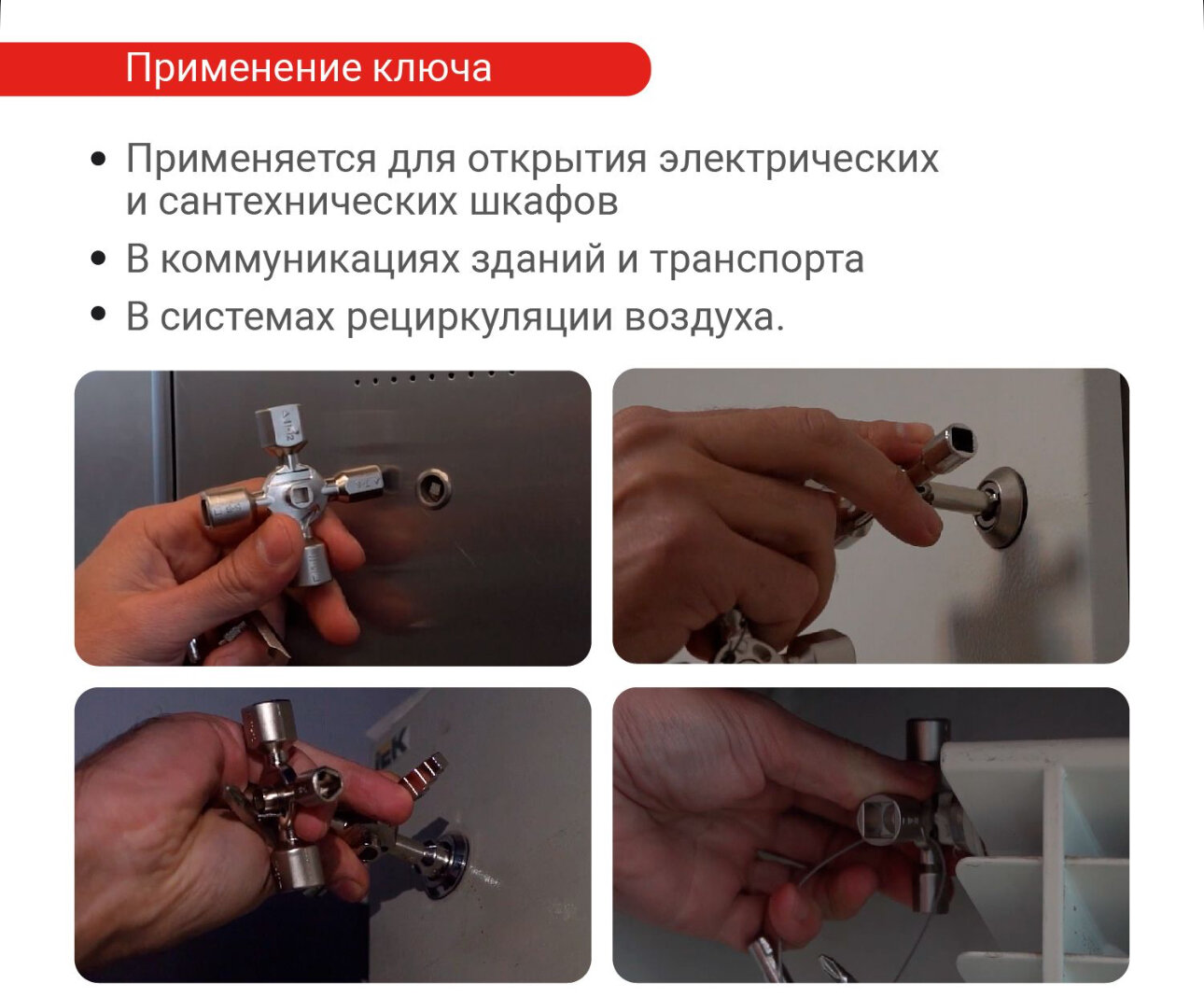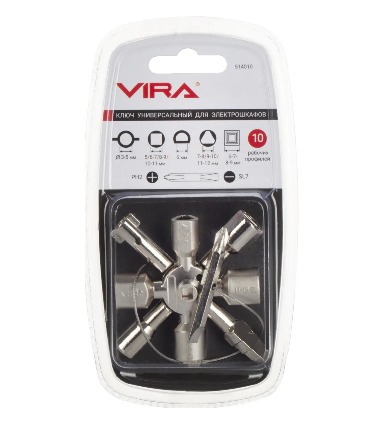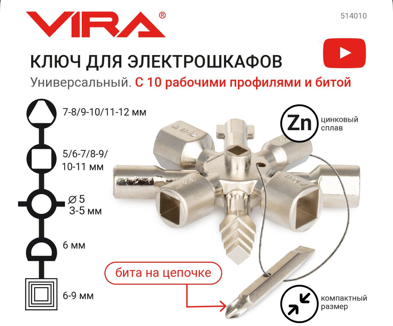 Ключ для электрошкафов с 10 рабочими профилями и битой VIRA применяется для открытия электрических и сантехнических шкафов, в коммуникациях зданий и транспорта, а также в системах рециркуляции воздуха. Благодаря простой форме и небольшим размерам инструмент удобно использовать и носить с собой. Двусторонняя бита закреплена на цепочке.