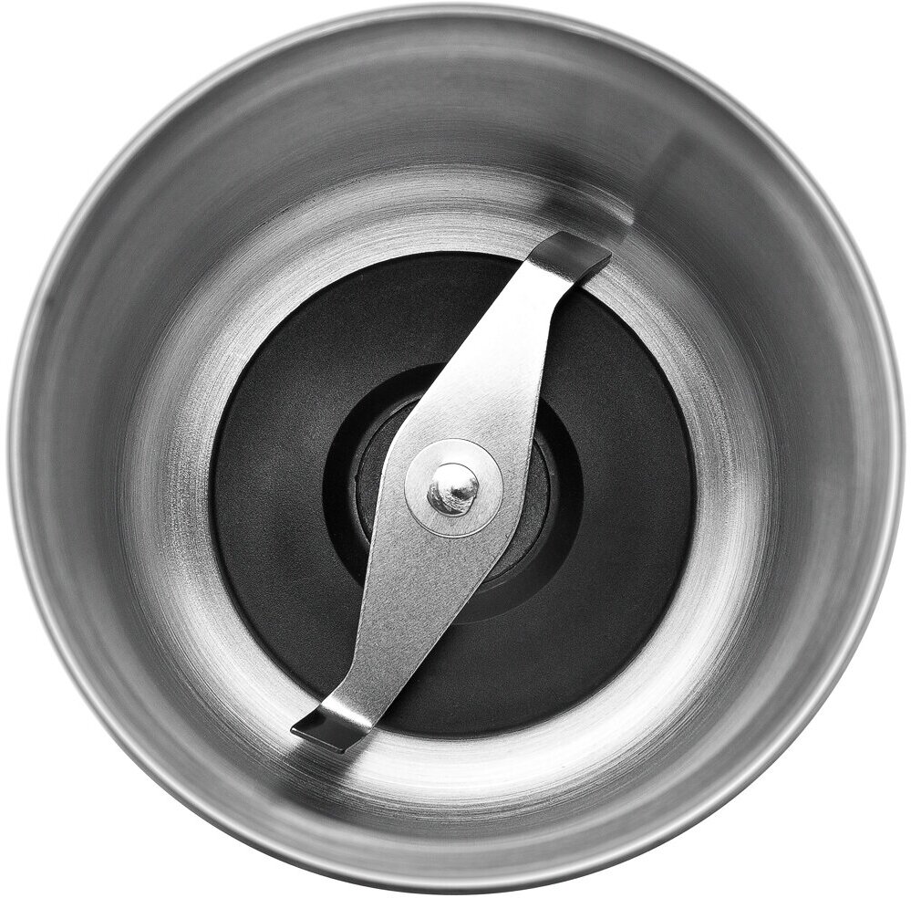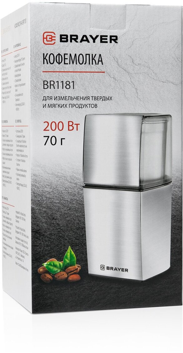Кофемолка с мощностью 200 Вт сможет перемолоть как кофейные зерна с орехами, так и измельчить мягкие продукты. Контейнер рассчитан на 70 г кофе. Такого объема хватит на несколько чашек кофе. В BR1181 установлены 2 ножа из нержавеющей стали для мягких и твердых продуктов.