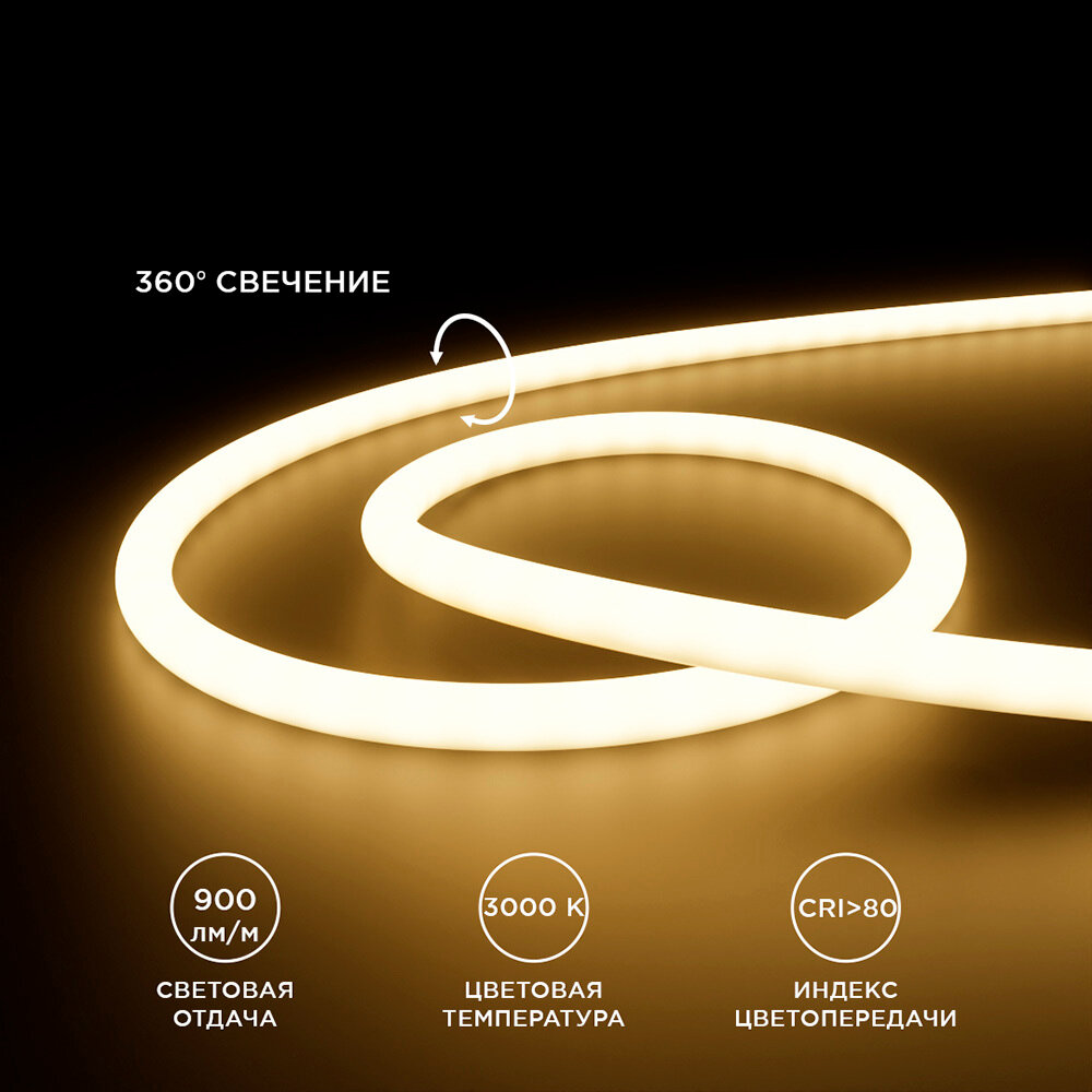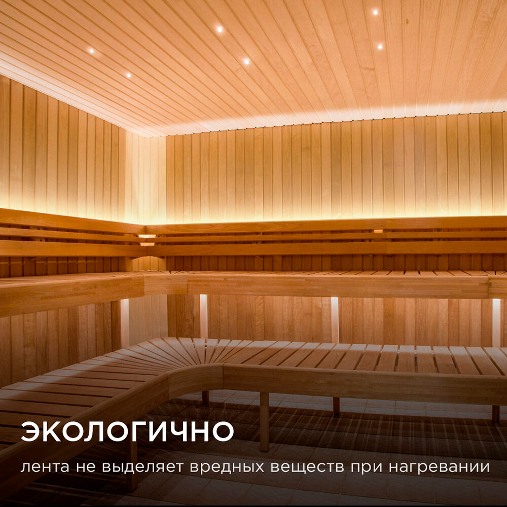 Светодиодная лента для бани и сауны с артикулом 00-323 работает от постоянного тока с напряжением 24 В. Благодаря светодиодам smd 2835 излучающим световой поток равный 900 Лм/м лента используется для вспомогательной декоративной подсветки областей интерьерного пространства. Светодиодная лента эквивалентна лампам накаливания мощностью 90 Вт. Данная модель светодиодной ленты обладает теплым белым цветом свечения с цветовой температурой 3000 К. При выборе светодиодной ленты важно учитывать такой параметр, как потребляемая мощность, чтобы правильно подобрать блок питания. У данной модели этот показатель равен 14,4 Вт на один метр. Степень защиты этого изделия соответствует стандарту IP68. Она предназначена для установки в помещениях с повышенной концентрацией влажности и повышенной температурой. Герметичная силиконовая оболочка позволяет использовать светодиодную ленту в банях и саунах. Не использовать в воде! Отрезать светодиодную ленту можно в специально отмеченных местах, которые располагаются через каждые 50 мм. В комплект поставки входит: светодиодная лента 5 м, крепеж 10 шт., заглушки 2 шт. в сборе + 1 шт. Подходит для использования в бане и сауне в качестве основного освещения и для декора. Энергоэффективность в 5 раз выше, чем у традиционных ламп накаливания. Может эксплуатироваться при повышенной влажности и температуре от -30°С до +100°С. Высокая светоотдача, равномерное свечение. - Длительный срок службы более 40 000 часов. Простота монтажа. Равномерное свечение по всей длине.